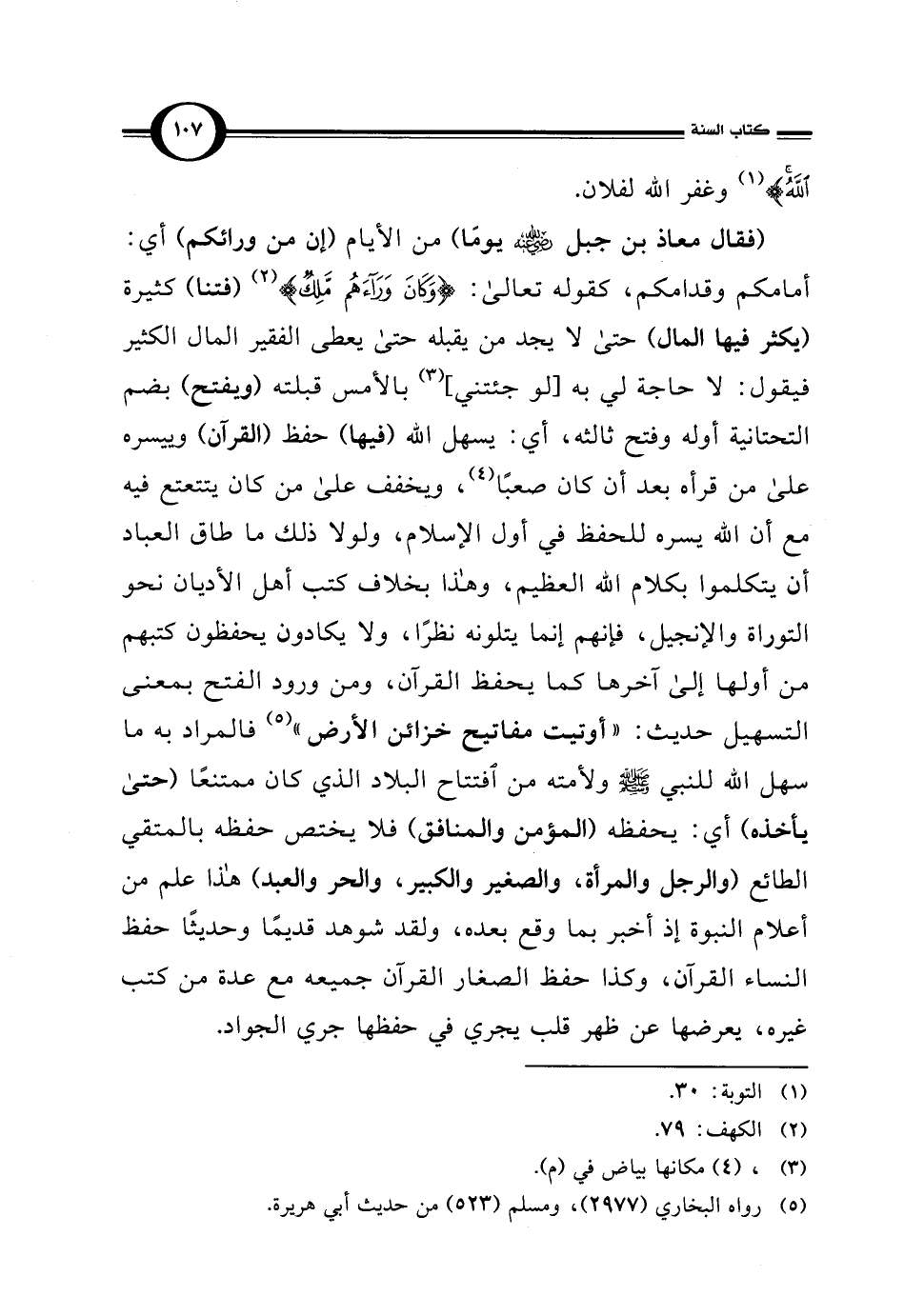 (فقال معاذ بن جبل -رضي اللَّه عنه- يومًا) من الأيام (إن من ورائكم) أي: أمامكم وقدامكم، كقوله تعالى: {وَكَانَ وَرَاءَهُمْ مَلِكٌ} (¬2) (فتنا) كثيرة (يكثر فيها المال) حتى لا يجد من يقبله حتى يعطى الفقير المال الكثير فيقول: لا حاجة لي به [لو جئتني] (¬3) بالأمس قبلته (ويفتح) بضم التحتانية أوله وفتح ثالثه، أي: يسهل اللَّه (فيها) حفظ (القرآن) وييسره على من قرأه بعد أن كان صعبًا (¬4)، ويخفف على من كان يتتعتع فيه مع أن اللَّه يسره للحفظ في أول الإسلام، ولولا ذلك ما طاق العباد أن يتكلموا بكلام اللَّه العظيم، وهذا بخلاف كتب أهل الأديان نحو التوراة والإنجيل، فإنهم إنما يتلونه نظرًا، ولا يكادون يحفظون كتبهم من أولها إلى آخرها كما يحفظ القرآن، ومن ورود الفتح بمعنى التسهيل حديث: "أوتيت مفاتيح خزائن الأرض" (¬5) فالمراد به ما سهل اللَّه للنبي -صلى اللَّه عليه وسلم- ولأمته من افتتاح البلاد الذي كان ممتنعًا (حتى يأخذه) أي: يحفظه (المؤمن والمنافق) فلا يختص حفظه بالمتقي الطائع (والرجل والمرأة، والصغير والكبير، والحر والعبد) هذا علم من أعلام النبوة إذ أخبر بما وقع بعده، ولقد شوهد قديمًا وحديثًا حفظ النساء القرآن، وكذا حفظ الصغار القرآن جميعه مع عدة من كتب غيره، يعرضها عن ظهر قلب يجري في حفظها جري الجواد.
