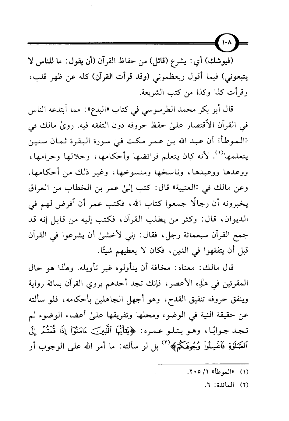 قال مالك: معناه: مخافة أن يتأولوه غير تأويله. وهذا هو حال المقرئين في هذِه الأعصر، فإنك تجد أحدهم يروي القرآن بمائة رواية وينفق حروفه تنفيق القدح، وهو أجهل الجاهلين بأحكامه، فلو سألته عن حقيقة النية في الوضوء ومحلها وتفريقها على أعضاء الوضوء لم تجد جوابًا، وهو يتلو عمره: {يَاأَيُّهَا الَّذِينَ آمَنُوا إِذَا قُمْتُمْ إِلَى الصَّلَاةِ فَاغْسِلُوا وُجُوهَكُمْ} (¬2) بل لو سألته: ما أمر اللَّه على الوجوب أو