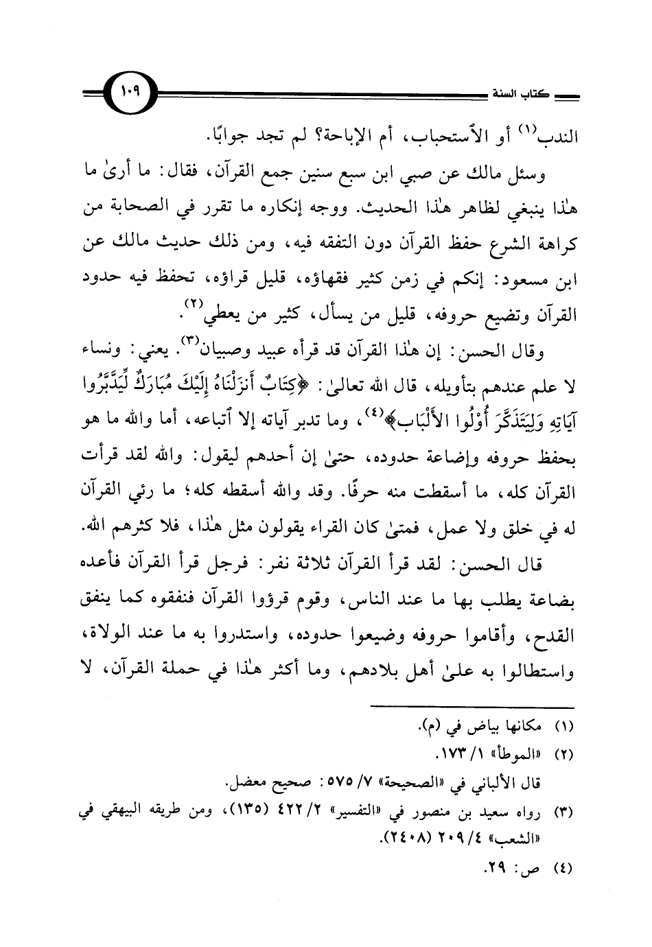وسئل مالك عن صبي ابن سبع سنين جمع القرآن، فقال: ما أرى ما هذا ينبغي لظاهر هذا الحديث. ووجه إنكاره ما تقرر في الصحابة من كراهة الشرع حفظ القرآن دون التفقه فيه، ومن ذلك حديث مالك عن ابن مسعود: إنكم في زمن كثير فقهاؤه، قليل قراؤه، تحفظ فيه حدود القرآن وتضيع حروفه، قليل من يسأل، كثير من يعطي (¬2).