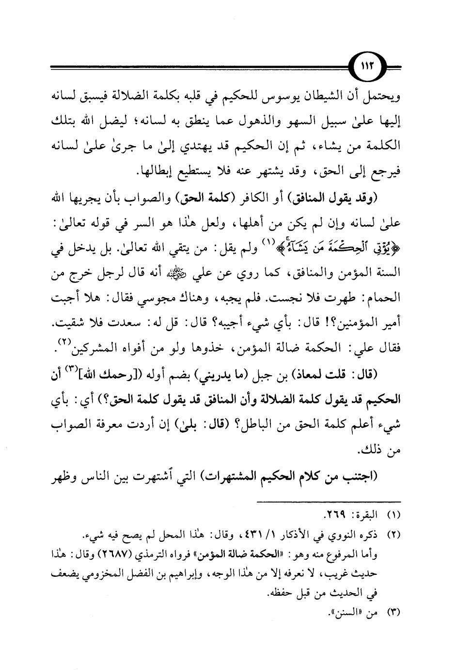 (وقد يقول المنافق) أو الكافر (كلمة الحق) والصواب بأن يجريها اللَّه على لسانه وإن لم يكن من أهلها، ولعل هذا هو السر في قوله تعالى: {يُؤْتِي الْحِكْمَةَ مَنْ يَشَاءُ} (¬1) ولم يقل: من يتقي اللَّه تعالى. بل يدخل في السنة المؤمن والمنافق، كما روي عن علي -رضي اللَّه عنه- أنه قال لرجل خرج من الحمام: طهرت فلا نجست. فلم يجبه، وهناك مجوسي فقال: هلا أجبت أمير المؤمنين؟ ! قال: بأي شيء أجيبه؟ قال: قل له: سعدت فلا شقيت. فقال علي: الحكمة ضالة المؤمن، خذوها ولو من أفواه المشركين (¬2).