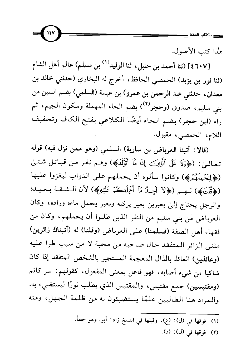 [4607] (ثنا أحمد بن حنبل، ثنا الوليد (¬1) بن مسلم) عالم أهل الشام (ثنا ثور بن يزيد) الحمصي الحافظ، أخرج له البخاري (حدثني خالد بن معدان، حدثني عبد الرحمن بن عمرو) بن عبسة (السلمي) بضم السين من بني سليم، صدوق (وحجر) (¬2) بضم الحاء المهملة وسكون الجيم، ثم راء (ابن حجر) بضم الحاء أيضًا الكلاعي بفتح الكاف وتخفيف اللام، الحمصي، مقبول.
