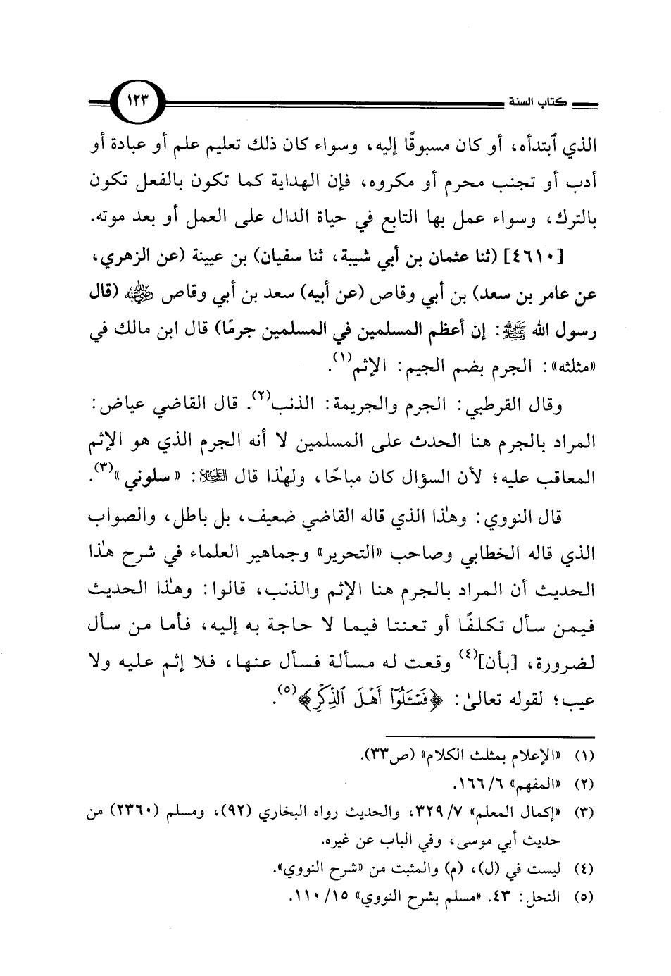 قال النووي: وهذا الذي قاله القاضي ضعيف، بل باطل، والصواب الذي قاله الخطابي وصاحب "التحرير" وجماهير العلماء في شرح هذا الحديث أن المراد بالجرم هنا الإثم والذنب، قالوا: وهذا الحديث فيمن سأل تكلفًا أو تعنتا فيما لا حاجة به إليه، فأما من سأل لضرورة، [بأن] (¬4) وقعت له مسألة فسأل عنها، فلا إثم عليه ولا عيب؛ لقوله تعالى: {فَاسْأَلُوا أَهْلَ الذِّكْرِ} (¬5).