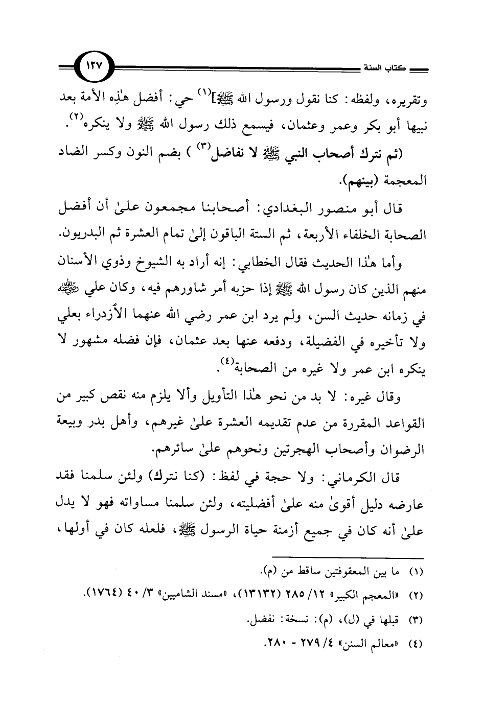 (ثم نترك أصحاب النبي -صلى اللَّه عليه وسلم- لا نفاضل) (¬3) بضم النون وكسر الضاد المعجمة (بينهم).