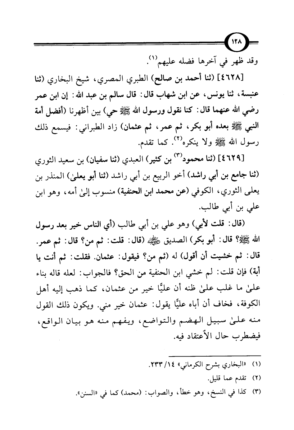 [4628] (ثنا أحمد بن صالح) الطبري المصري، شيخ البخاري (ثنا عنبسة، ثنا يونس، عن ابن شهاب قال: قال سالم بن عبد اللَّه: إن ابن عمر رضي اللَّه عنهما قال: كنا نقول ورسول اللَّه -صلى اللَّه عليه وسلم- حي) بين أظهرنا (أفضل أمة النبي -صلى اللَّه عليه وسلم- بعده أبو بكر، ثم عمر، ثم عثمان) زاد الطبراني: فيسمع ذلك رسول اللَّه -صلى اللَّه عليه وسلم- ولا ينكره (¬2). كما تقدم.