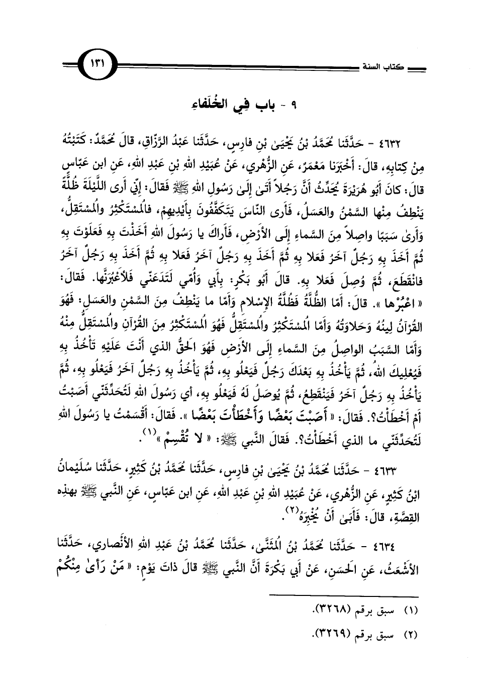 4632 - حَدَّثَنا مُحَمَّد بْن يَحْيَى بْنِ فارِسٍ، حَدَّثَنا عَبْدُ الرَّزّاقِ، قالَ مُحَمَّدٌ: كَتَبْبُهُ مِنْ كِتابِهِ، قالَ: أَخْبَرَنا مَعْمَرٌ، عَنِ الزُّهْري، عَنْ عُبَيْدِ اللَّهِ بْنِ عَبْدِ اللَّهِ، عَنِ ابن عَبّاسٍ قالَ: كانَ أَبُو هُرَيْرَةَ يُحَدِّثُ أَنَّ رَجُلًا أَتَى إِلَى رَسُولِ اللَّهِ -صلى اللَّه عليه وسلم- فَقالَ: إِنّي أَرى اللَّيْلَةَ ظُلَّةً يَنْطِفُ مِنْها السَّمْنُ والعَسَلُ، فَأَرى الِنّاسَ يَتَكَفَّفُونَ بِأَيْدِيهِمْ، فالمُسْتَكْثِرُ والمُسْتَقِلُّ، وَأَرى سَبَبًا واصِلًا مِنَ السَّماءِ إِلَى الأَرْضِ، فَأَراكَ يا رَسُولَ أَخَذْتَ بِهِ فَعَلَوْتَ بِهِ ثُمَّ أَخَذَ بِهِ رَجُلٌ آخَرُ فَعَلا بِهِ ثُمَّ أَخَذَ بِهِ رَجُلٌ آخَرُ فَعَلا بِهِ ثُمَّ أَخَذَ بِهِ رَجُلٌ آخَرُ فانْقَطَعَ، ثُمَّ وُصِلَ فَعَلا بِهِ. قالَ أَبُو بَكْرٍ: بِأَبي وَأُمّي لَتَدَعَنّي فَلأَعْبُرَنَّها. فَقالَ: "اعْبُرْها". قالَ: أَمّا الظُّلَّةُ فَظُلَّةُ الإِسْلامِ وَأَمّا ما يَنْطِفُ مِنَ السَّمْنِ والعَسَلِ. فَهُوَ القُرْآنُ لِينُهُ وَحَلاوَتُهُ وَأَمّا المُسْتَكْثِرُ والمُسْتَقِلُّ فَهُوَ المُسْتَكْثِرُ مِنَ القُرْآنِ والمُسْتَقِلُّ مِنْهُ وَأَمّا السَّبَبُ الواصِلُ مِنَ السَّماءِ إِلَى الأَرْضِ فَهُوَ الحَقُّ الذي أَنْتَ عَلَيْهِ تَأْخُذُ بِهِ فَيُعْلِيكَ اللَّهُ، ثُمَّ يَأْخُذُ بِهِ بَعْدَكَ رَجُلٌ فَيَعْلُو بِهِ، ثُمَّ يَأْخُذُ بِهِ رَجُلٌ اَخَرُ فَيَعْلُو بِهِ، ثُمَّ يَأْخُذُ بِهِ رَجُلٌ آخَرُ فَيَنْقَطِعُ، ثُمَّ يُوصَلُ لَهُ فَيَعْلُو بِهِ، أي رَسُولَ اللَّهِ لَتُحَدِّثَنّي أَصَبْتُ أَمْ أَخْطَأْتُ؟ . فَقالَ: "أَصَبْتَ بَعْضًا وَأَخْطَأْتَ بَعْضًا". فَقالَ: أَقْسَمْتُ يا رَسُولَ اللَّهِ لَتُحَدِّثَنّي ما الذي أَخْطَأْتُ؟ . فَقالَ النَّبي -صلى اللَّه عليه وسلم-: "لا تُقْسِمْ" (¬1).