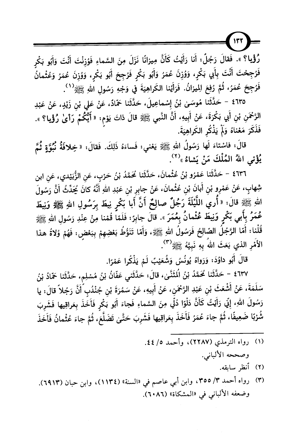 رُؤْيا؟ ". فَقالَ رَجُلٌ: أَنا رَأَيْتُ كَأَنَّ مِيزانًا نَزَلَ مِنَ السَّماءِ فَوُزِنْتَ أَنْتَ وَأَبُو بَكْرٍ فَرُجِحْتَ أَنْتَ بِأَبي بَكْرٍ، وَوُزِنَ عُمَرُ وَأَبُو بَكْرٍ فَرُجِحَ أَبُو بَكْرٍ، وَوُزِنَ عُمَرُ وَعُثْمانُ فَرُجِحَ عُمَرُ، ثُمَّ رُفِعَ المِيزانُ. فَرَأَيْنا الكَراهِيَةَ في وَجْهِ رَسُولِ اللَّهِ -صلى اللَّه عليه وسلم- (¬1).