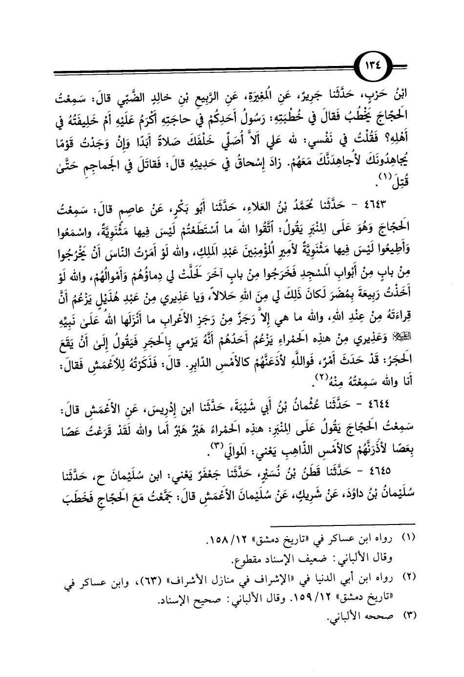4643 - حَدَّثَنا مُحَمَّدُ بْنُ العَلاءِ، حَدَّثَنا أَبُو بَكْرٍ، عَنْ عاصِمٍ قالَ: سَمِعْتُ الحَجّاجَ وَهُوَ عَلَى المِنْبَرِ يَقُولُ: اتَّقُوا اللَّهَ ما اسْتَطَعْتمْ لَيْسَ فِيها مَثْنَوِيَّةٌ، واسْمَعُوا وَأَطِيعُوا لَيْسَ فِيها مَثْنَوِيَّةٌ لأَمِيرِ المُؤْمِنِينَ عَبْدِ المَلِكِ، واللَّه لَوْ أَمَرْتُ النّاسَ أَنْ يَخْرُجُوا مِنْ بابٍ مِنْ أَبْوابِ المَسْجِدِ فَخَرَجُوا مِنْ بابٍ آخَرَ لَحَلَّتْ لي دِماؤُهُمْ وَأَمْوالُهُمْ، واللَّه لَوْ أَخَذْتُ رَبِيعَةَ بِمُضَرَ لَكانَ ذَلِكَ لي مِنَ اللَّهِ حَلالًا، وَيا عَذِيري مِنْ عَبْدِ هُذَيْلٍ يَزْعُمُ أَنَّ قِراءَتَهُ مِنْ عِنْدِ اللَّهِ، واللَّه ما هي إِلَّا رَجَزٌ مِنْ رَجَزِ الأَعْرابِ ما أَنْزَلَها اللَّهُ عَلَى نَبِيِّهِ عليه السلام وَعَذِيري مِنْ هذِه الحَمْراءِ يَزْعُمُ أَحَدُهُمْ أَنَّهُ يَرْمي بِالحَجَرِ فَيَقُولُ إِلَى أَنْ يَقَعَ الحَجَرُ: قَدْ حَدَثَ أَمْرٌ، فَواللَّهِ لأَدَعَنَّهُمْ كالأَمْسِ الدّابِرِ. قالَ: فَذَكَرْتُهُ لِلأَعْمَشِ فَقالَ: أَنَا واللَّه سَمِعْتُهُ مِنْهُ (¬2).