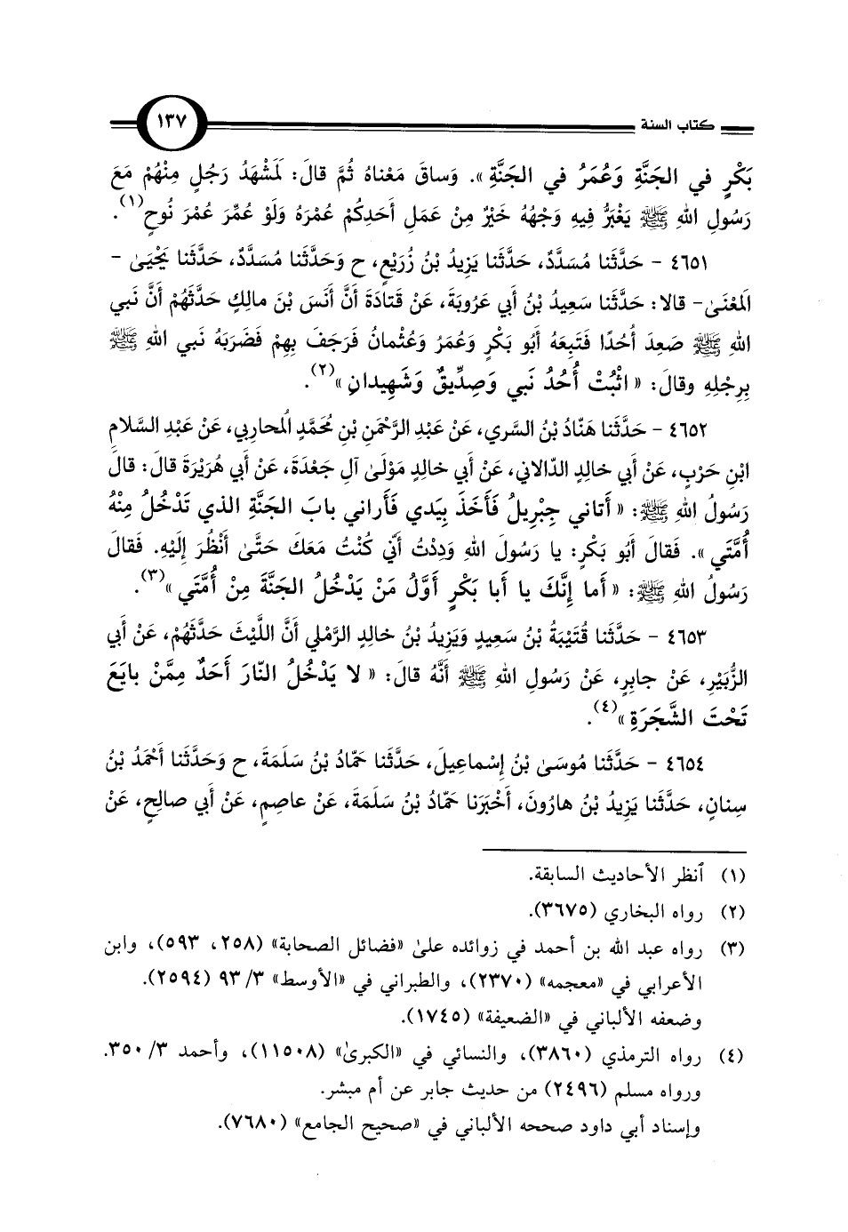 4651 - حَدَّثَنا مُسَدَّدٌ، حَدَّثَنا يَزِيدُ بْنُ زُرَيْعٍ، ح وَحَدَّثَنا مُسَدَّدٌ، حَدَّثَنا يَحْيَى -المَعْنَى- قالا: حَدَّثَنا سَعِيدُ بْن أَبي عَرُوبَةَ، عَنْ قَتادَةَ أَنَّ أَنَسَ بْنَ مالِكٍ حَدَّثَهُمْ أَنَّ نَبي اللَّهِ -صلى اللَّه عليه وسلم- صَعِدَ أُحُدًا فَتَبِعَهُ أَبُو بَكْرٍ وَعُمَرُ وَعُثْمانُ فَرَجَفَ بِهِمْ فَضَرَبَهُ نَبي اللَّهِ -صلى اللَّه عليه وسلم- بِرِجْلِهِ وقالَ: "اثْبُتْ أُحُدُ نَبي وَصِدِّيقٌ وَشَهِيدانِ" (¬2).