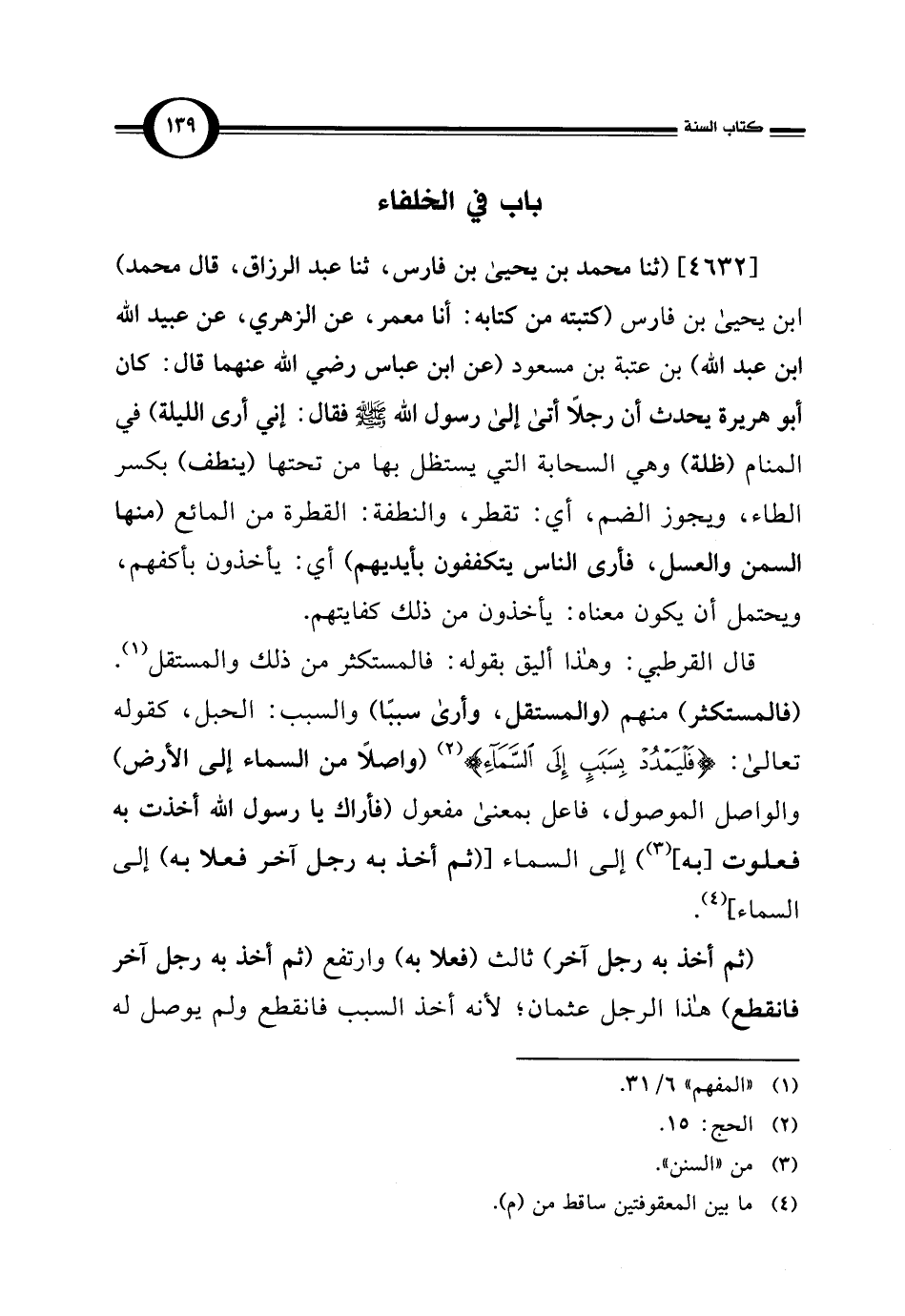 قال القرطبي: وهذا أليق بقوله: فالمستكثر من ذلك والمستقل (¬1). (فالمستكثر) منهم (والمستقل، وأرى سببًا) والسبب: الحبل، كقوله تعالى: {فَلْيَمْدُدْ بِسَبَبٍ إِلَى السَّمَاءِ} (¬2) (واصلًا من السماء إلى الأرض) والواصل الموصول، فاعل بمعنى مفعول (فأراك يا رسول اللَّه أخذت به فعلوت [به]) (¬3) إلى السماء [(ثم أخذ به رجل آخر فعلا به) إلى السماء] (¬4).