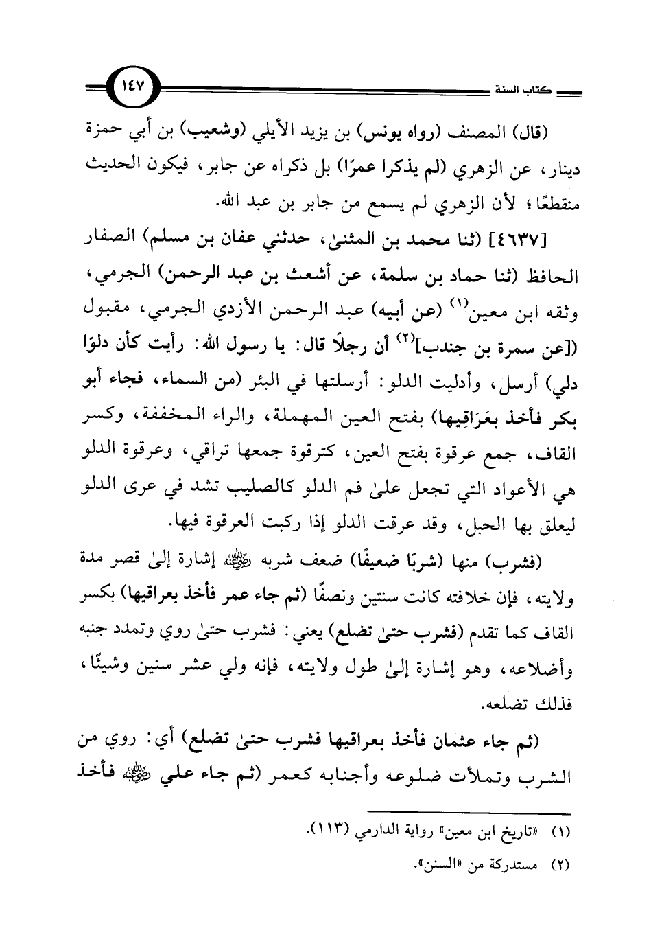 [4637] (ثنا محمد بن المثنى، حدثني عفان بن مسلم) الصفار الحافظ (ثنا حماد بن سلمة، عن أشعث بن عبد الرحمن) الجرمي، وثقه ابن معين (¬1) (عن أبيه) عبد الرحمن الأزدي الجرمي، مقبول ([عن سمرة بن جندب] (¬2) أن رجلًا قال: يا رسول اللَّه: رأيت كأن دلوًا دلي) أرسل، وأدليت الدلو: أرسلتها في البئر (من السماء، فجاء أبو بكر فاخذ بعَرَاقِيها) بفتح العين المهملة، والراء المخففة، وكسر القاف، جمع عرقوة بفتح العين، كترقوة جمعها تراقي، وعرقوة الدلو هي الأعواد التي تجعل على فم الدلو كالصليب تشد في عرى الدلو ليعلق بها الحبل، وقد عرقت الدلو إذا ركبت العرقوة فيها.