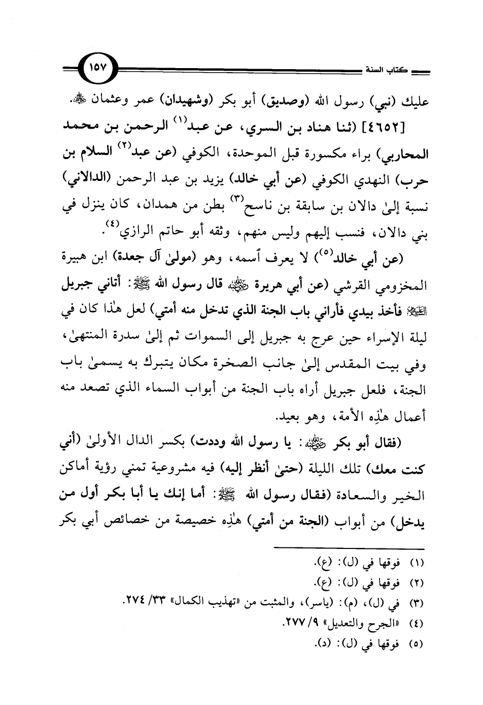 [4652] (ثنا هناد بن السري، عن عبد (¬1) الرحمن بن محمد المحاربي) براء مكسورة قبل الموحدة، الكوفي (عن عبد (¬2) السلام بن حرب) النهدي الكوفي (عن أبي خالد) يزيد بن عبد الرحمن (الدالاني) نسبة إلى دالان بن سابقة بن ناسح (¬3) بطن من همدان، كان ينزل في بني دالان، فنسب إليهم وليس منهم، وثقه أبو حاتم الرازي (¬4).