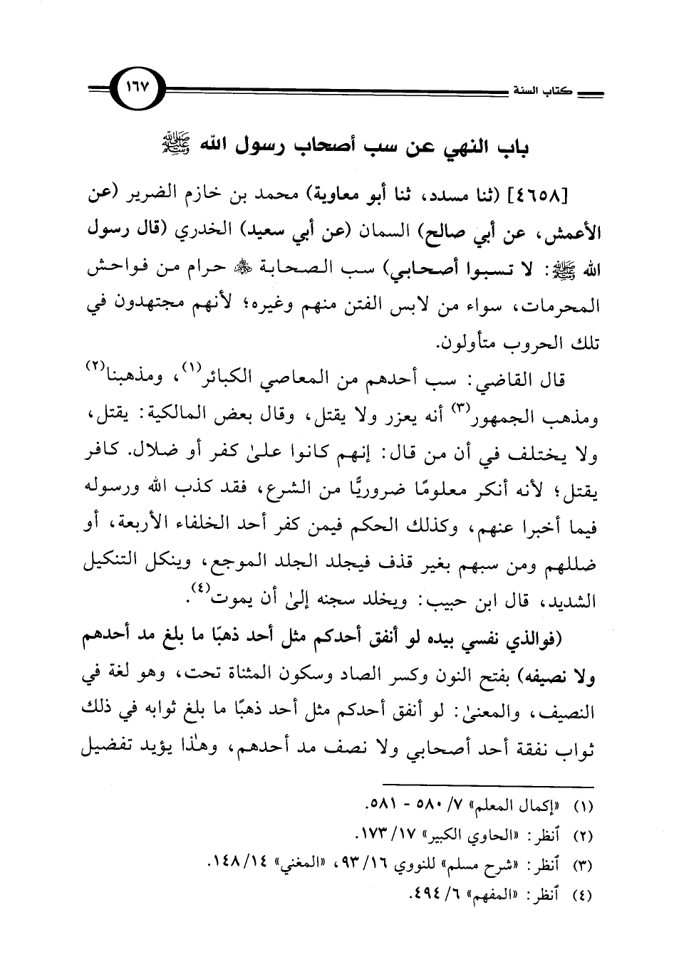 [4658] (ثنا مسدد، ثنا أبو معاوية) محمد بن خازم الضرير (عن الأعمش، عن أبي صالح) السمان (عن أبي سعيد) الخدري (قال رسول اللَّه -صلى اللَّه عليه وسلم-: لا تسبوا أصحابي) سب الصحابة -رضي اللَّه عنهم- حرام من فواحش المحرمات، سواء من لابس الفتن منهم وغيره؛ لأنهم مجتهدون في تلك الحروب متأولون.