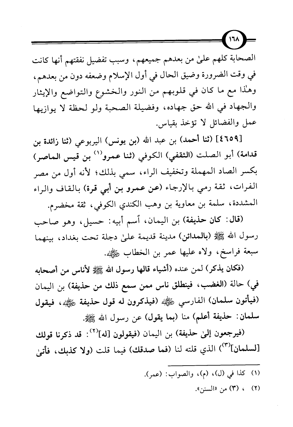 (فيرجعون إلى حذيفة) بن اليمان (فيقولون [له] (¬2): قد ذكرنا قولك [لسلمان]) (¬3) الذي قلته لنا (فما صدقك) فيما قلت (ولا كذبك، فأتى
