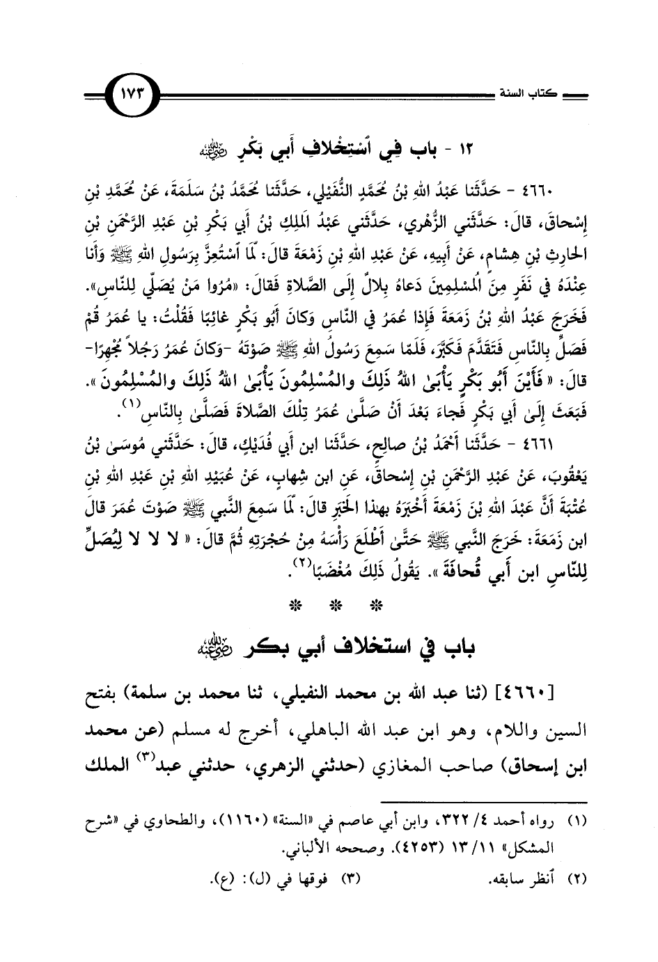 4660 - حَدَّثَنا عَبْدُ اللَّهِ بْن مُحَمَّدٍ النُّفَيْلي، حَدَّثَنا مُحَمَّدُ بْنُ سَلَمَةَ، عَنْ مُحَمَّدِ بْنِ إِسْحاقَ، قالَ: حَدَّثَني الزُّهْري، حَدَّثَني عَبْدُ المَلِكِ بْنُ أَبي بَكْرِ بْنِ عَبْدِ الرَّحْمَنِ بْنِ الحارِثِ بْنِ هِشامٍ، عَنْ أَبِيهِ، عَنْ عَبْدِ اللَّهِ بْنِ زَمْعَةَ قالَ: لَمّا اسْتُعِزَّ بِرَسُولِ اللَّهِ -صلى اللَّه عليه وسلم- وَأَنا عِنْدَهُ في نَفَرٍ مِنَ المُسْلِمِينَ دَعاهُ بِلالٌ إِلَى الصَّلاةِ فَقالَ: "مُرُوا مَنْ يُصَلّي لِلنّاسِ". فَخَرَجَ عَبْدُ اللَّهِ بْنُ زَمَعَةَ فَإِذا عُمَرُ في النّاسِ وَكانَ أَبُو بَكْرٍ غائِبًا فَقُلْتُ: يا عُمَرُ قُمْ فَصَلِّ بِالنّاسِ فَتَقَدَّمَ فَكَبَّرَ، فَلَمّا سَمِعَ رَسُولُ اللَّهِ -صلى اللَّه عليه وسلم- صَوْتَهُ -وَكانَ عُمَرُ رَجُلًا مُجْهِرًا- قالَ: "فَأَيْنَ أَبُو بَكْرٍ يَأْبَى اللَّهُ ذَلِكَ والمُسْلِمُونَ يَأْبَى اللَّهُ ذَلِكَ والمُسْلِمُونَ". فَبَعَثَ إِلَى أَبي بَكْرٍ فَجاءَ بَعْدَ أَنْ صَلَّى عُمَرُ تِلْكَ الصَّلاةَ فَصَلَّى بِالنّاسِ (¬1).