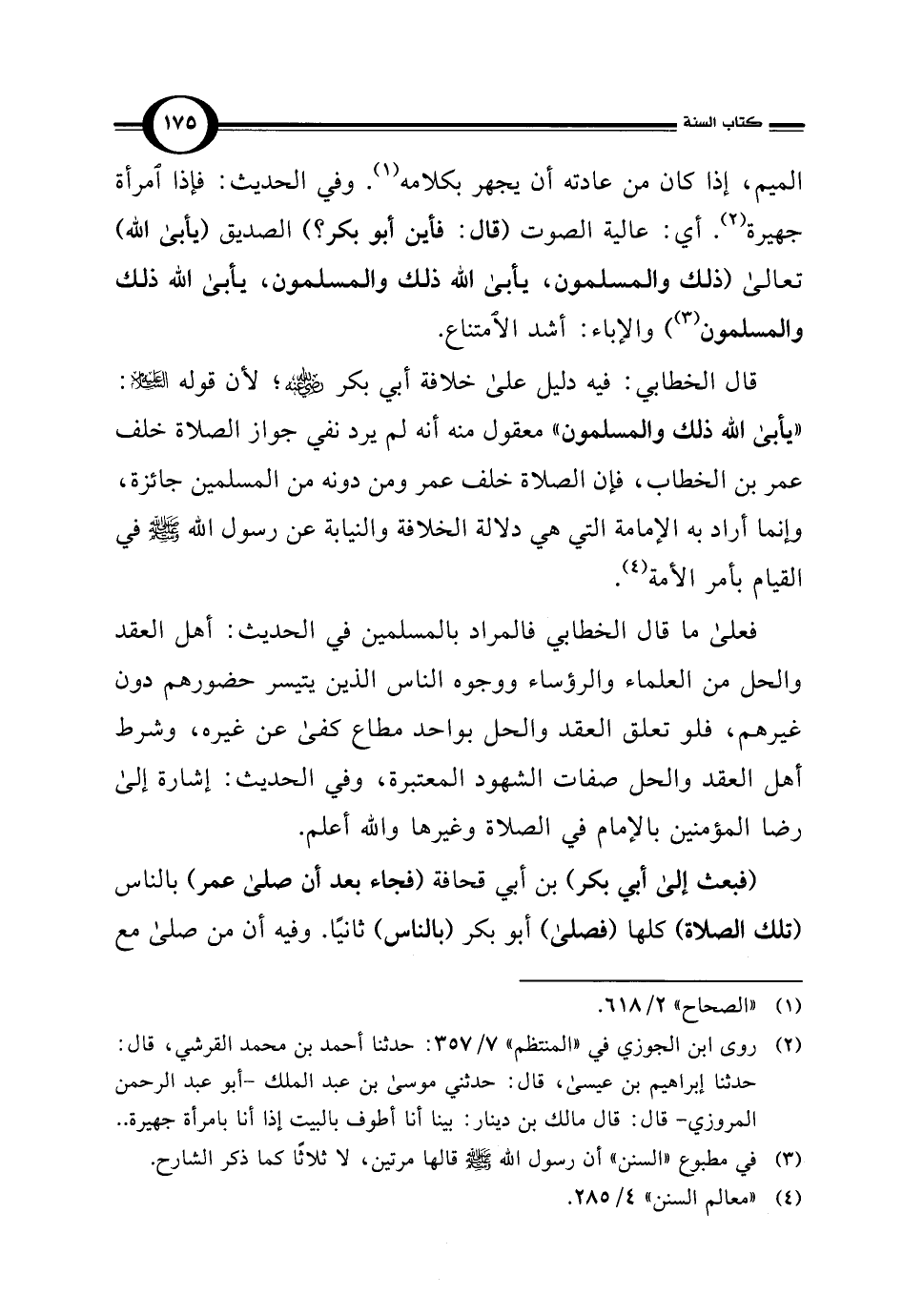 قال الخطابي: فيه دليل على خلافة أبي بكر -رضي اللَّه عنه-؛ لأن قوله عليه السلام: "يأبى اللَّه ذلك والمسلمون" معقول منه أنه لم يرد نفي جواز الصلاة خلف عمر بن الخطاب، فإن الصلاة خلف عمر ومن دونه من المسلمين جائزة، وإنما أراد به الإمامة التي هي دلالة الخلافة والنيابة عن رسول اللَّه -صلى اللَّه عليه وسلم- في القيام بأمر الأمة (¬4).