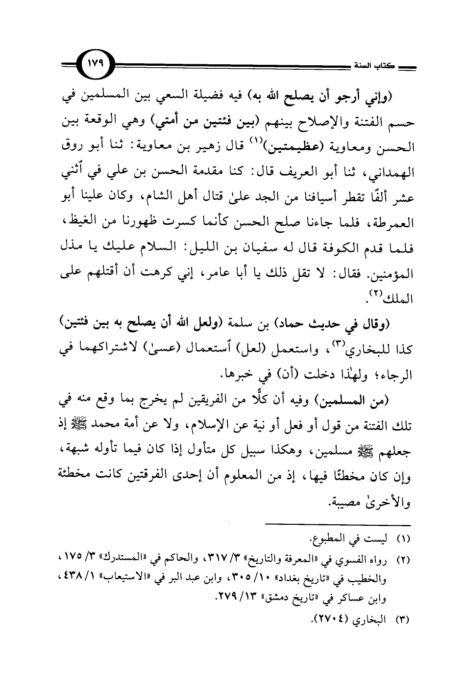 (من المسلمين) وفيه أن كلًّا من الفريقين لم يخرج بما وقع منه في تلك الفتنة من قول أو فعل أو نية عن الإسلام، ولا عن أمة محمد -صلى اللَّه عليه وسلم- إذ جعلهم -صلى اللَّه عليه وسلم- مسلمين، وهكذا سبيل كل متأول إذا كان فيما تأوله شبهة، وإن كان مخطئًا فيها، إذ من المعلوم أن إحدى الفرقتين كانت مخطئة والأخرى مصيبة.