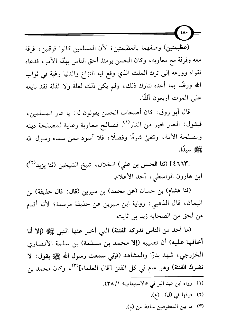 (عظيمتين) وصفهما بالعظيمتين؛ لأن المسلمين كانوا فرقتين، فرقة معه وفرقة مع معاوية، وكان الحسن يومئذ أحق الناس بهذا الأمر، فدعاه تقواه وورعه إلى ترك الملك الذي وقع فيه النزاع والدنيا رغبة في ثواب اللَّه ورضًا بما أعده لتارك ذلك، ولم يكن ذلك لعلة ولا لذلة فقد بايعه على الموت أربعون ألفًا.