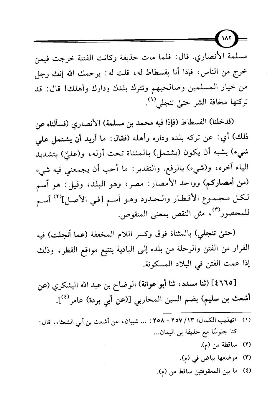 (فدخلنا) الفسطاط (فإذا فيه محمد بن مسلمة) الأنصاري (فسألناه عن ذلك) أي: عن تركه بلده وداره وأهله (فقال: ما أريد أن يشتمل علي شيء) يشبه أن يكون (يشتمل) بالمثناة تحت أوله، و (عليَّ) بتشديد الياء آخره، و (شيء) بالرفع. والتقدير: ما أحب أن يجمعني فيه شيء (من أمصاركم) وواحد الأمصار: مصر، وهو البلد، وقيل: هو اسم لكل مجموع الأقطار والحدود وهو اسم [في الأصل] (¬2) اسم للمحصور (¬3)، مثل النقص بمعنى المنقوص.