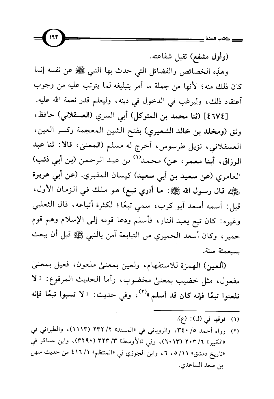 [4674] (ثنا محمد بن المتوكل) أبي السري (العسقلاني) حافظ، وثق (ومخلد بن خالد الشعيري) بفتح الشين المعجمة وكسر العين، العسقلاني، نزيل طرسوس، أخرج له مسلم (المعنى، قالا: ثنا عبد الرزاق، أبنا معمر، عن) محمد (¬1) بن عبد الرحمن (بن أبي ذئب) العامري (عن سعيد بن أبي سعيد) كيسان المقبري. (عن أبي هريرة -رضي اللَّه عنه- قال رسول اللَّه -صلى اللَّه عليه وسلم-: ما أدري تبع) هو ملك في الزمان الأول، قيل: اسمه أسعد أبو كرب، سمي تبعًا؛ لكثرة أتباعه، قال الثعلبي وغيره: كان تبع يعبد النار، فأسلم ودعا قومه إلى الإسلام وهم قوم حمير، وكان أسعد الحميري من التبابعة آمن بالنبي -صلى اللَّه عليه وسلم- قبل أن يبعث بسبعمئة سنة.
