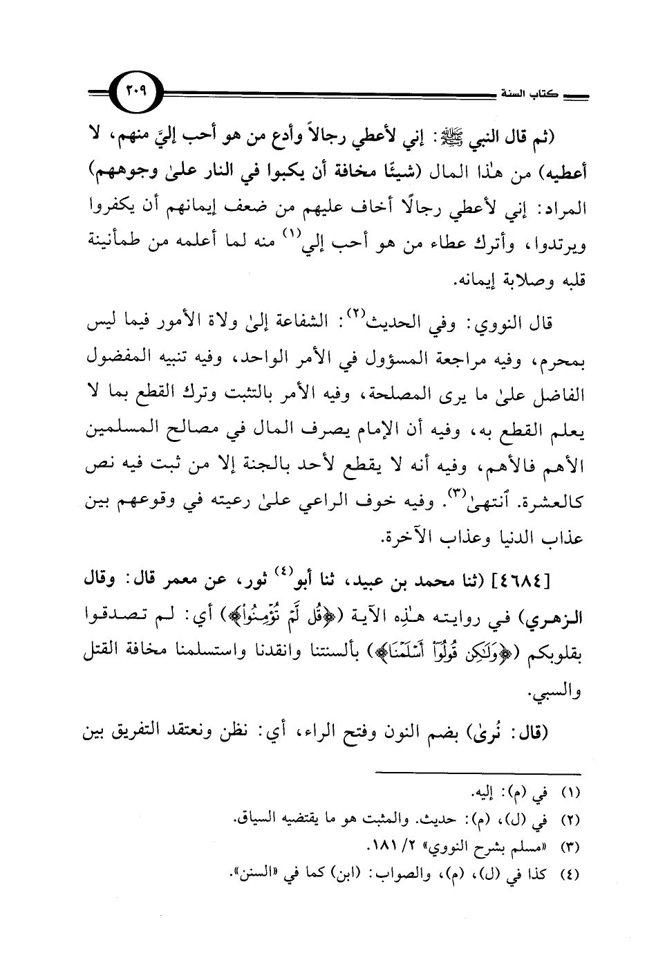 (ثم قال النبي -صلى اللَّه عليه وسلم-: إني لأعطي رجالًا وأدع من هو أحب إليَّ منهم، لا أعطيه) من هذا المال (شيئًا مخافة أن يكبوا في النار على وجوههم) المراد: إني لأعطي رجالًا أخاف عليهم من ضعف إيمانهم أن يكفروا ويرتدوا، وأترك عطاء من هو أحب إلي (¬1) منه لما أعلمه من طمأنينة قلبه وصلابة إيمانه.