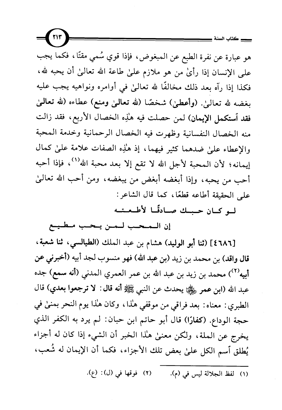 [4686] (ثنا أبو الوليد) هشام بن عبد الملك (الطيالسي، ثنا شعبة، قال واقد) بن محمد بن زيد (بن عبد اللَّه) فهو منسوب لجد أبيه (أخبرني عن أبيه) (¬2) محمد بن زيد بن عبد اللَّه بن عمر العمري المدني (أنه سمع) جده عبد اللَّه (ابن عمر -رضي اللَّه عنهما- يحدث عن النبي -صلى اللَّه عليه وسلم- أنه قال: لا ترجعوا بعدي) قال الطبري: معناه: بعد فراقي من موقفي هذا، وكان هذا يوم النحر بمنى في حجة الوداع. (كفارًا) قال أبو حاتم ابن حبان: لم يرد به الكفر الذي يخرج عن الملة، ولكن معنى هذا الخبر أن الشيء إذا كان له أجزاء يُطلق اسم الكل على بعض تلك الأجزاء، فكما أن الإيمان له شُعب،
