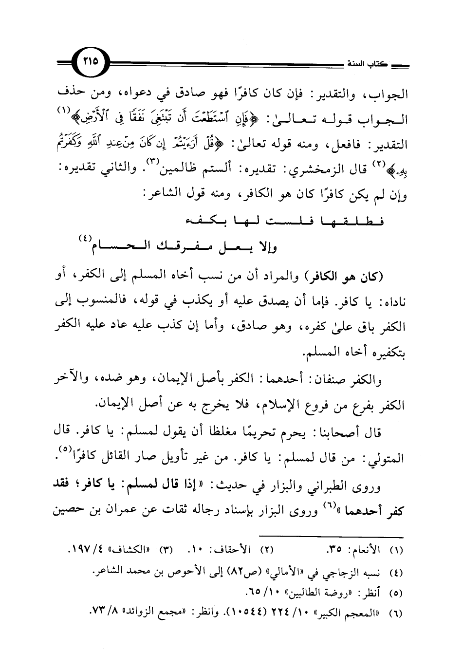 وروى الطبراني والبزار في حديث: "إذا قال لمسلم: يا كافر؛ فقد كفر أحدهما" (¬6) وروى البزار بإسناد رجاله ثقات عن عمران بن حصين