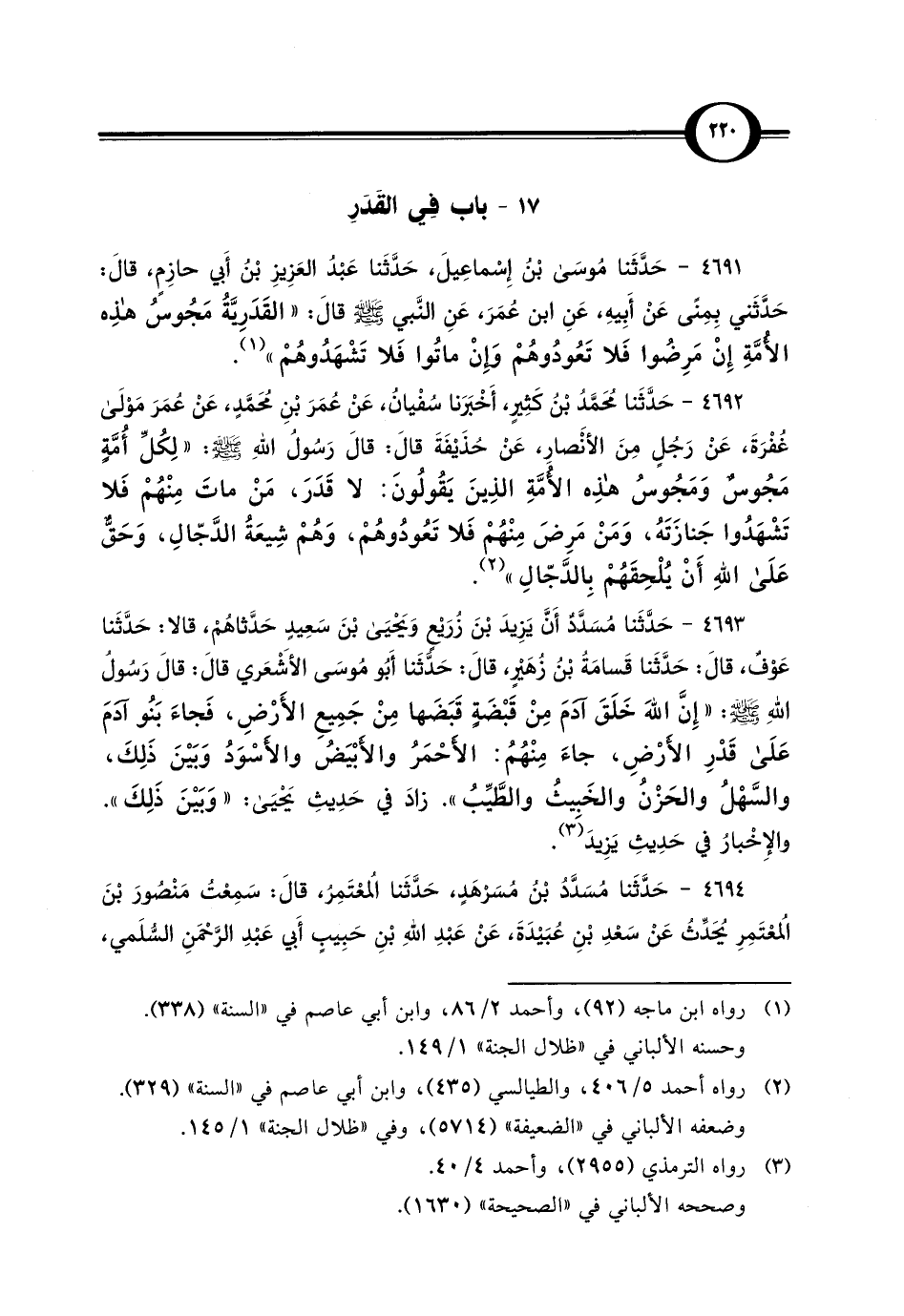 4692 - حَدَّثَنا مُحَمَّدُ بْنُ كَثِيرٍ، أَخْبَرَنا سُفْيانُ، عَنْ عُمَرَ بْنِ مُحَمَّدٍ، عَنْ عُمَرَ مَوْلَى عُفْرَةَ، عَنْ رَجُلٍ مِنَ الأَنْصارِ، عَنْ حُذَيْفَةَ قالَ: قالَ رَسُولُ اللَّهِ -صلى اللَّه عليه وسلم-: "لِكُلِّ أُمَّةٍ مَجُوسٌ وَمَجُوسُ هَذِه الأُمَّةِ الذِينَ يَقُولُونَ: لا قَدَرَ، مَنْ ماتَ مِنْهُمْ فَلا تَشْهَدُوا جَنازَتَهُ، وَمَنْ مَرِضَ مِنْهُمْ فَلا تَعُودُوهُمْ، وَهُمْ شِيعَةُ الدَّجّالِ، وَحَقٌّ عَلَى اللَّهِ أَنْ يُلْحِقَهُمْ بِالدَّجّالِ" (¬2).