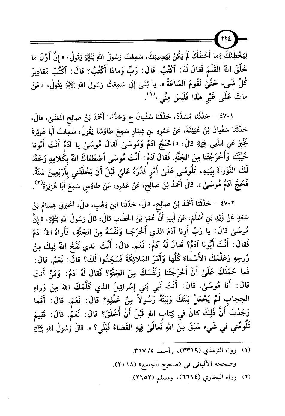 4701 - حَدَّثَنا مُسَدَّدٌ، حَدَّثَنا سُفْيانُ ح وَحَدَّثَنا أَحْمَدُ بْن صالِحٍ المَعْنَى، قالَ: حَدَّثَنا سُفْيان بْنُ عُيَيْنَةَ، عَنْ عَمْرِو بْنِ دِينارٍ سَمِعَ طاوُسًا يَقُولُ: سَمِعْتُ أَبا هُرَيْرَةَ يُخْبِرُ عَنِ النَّبي -صلى اللَّه عليه وسلم- قالَ: "احْتَجَّ آدَمُ وَمُوسَى فَقالَ مُوسَى يا آدَمُ أَنْتَ أَبُونا خَيَّبْتَنا وَأَخْرَجْتَنا مِنَ الجَنَّةِ. فَقالَ آدَمُ: أَنْتَ مُوسَى اصْطَفاكَ اللَّهُ بِكَلامِهِ وَخَطَّ لَكَ التَّوْراةَ بِيَدِهِ، تَلُومُني عَلَى أَمْرٍ قَدَّرَهُ عَليَّ قَبْلَ أَنْ يَخْلُقَني بِأَرْبَعِينَ سَنَةً. فَحَجَّ آدَمُ مُوسَى". قالَ أَحْمَدُ بْنُ صالِحٍ: عَنْ عَمْرٍو، عَنْ طاوُسٍ سَمِعَ أَبَا هُرَيْرَةَ (¬2).