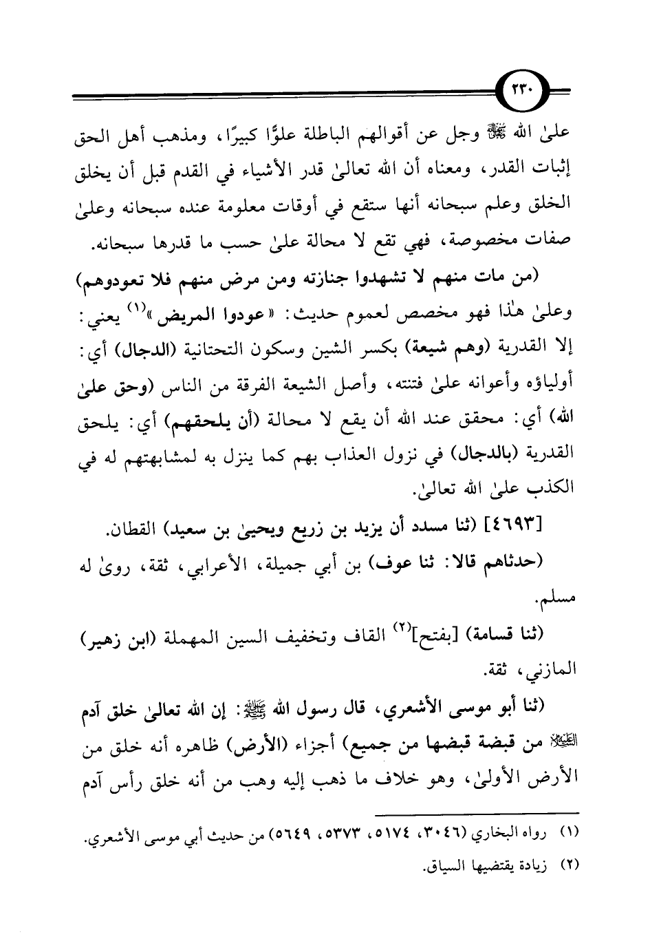 على اللَّه سبحانه وتعالى وجل عن أقوالهم الباطلة علوًّا كبيرًا، ومذهب أهل الحق إثبات القدر، ومعناه أن اللَّه تعالى قدر الأشياء في القدم قبل أن يخلق الخلق وعلم سبحانه أنها ستقع في أوقات معلومة عنده سبحانه وعلى صفات مخصوصة، فهي تقع لا محالة على حسب ما قدرها سبحانه.