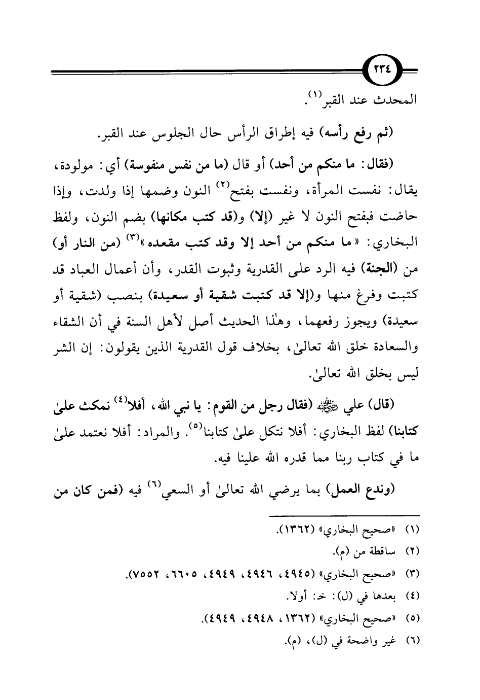(قال) علي -رضي اللَّه عنه- (فقال رجل من القوم: يا نبي اللَّه، أفلا (¬4) نمكث على كتابنا) لفظ البخاري: أفلا نتكل على كتابنا (¬5). والمراد: أفلا نعتمد على ما في كتاب ربنا مما قدره اللَّه علينا فيه.