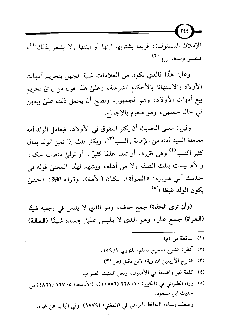 وعلى هذا فالذي يكون من العلامات غلبة الجهل بتحريم أمهات الأولاد والاستهانة بالأحكام الشرعية، وعلى هذا قول من يرى تحريم بيع أمهات الأولاد، وهم الجمهور، ويصح أن يحمل ذلك على بيعهن في حال حملهن، وهو محرم بالإجماع.