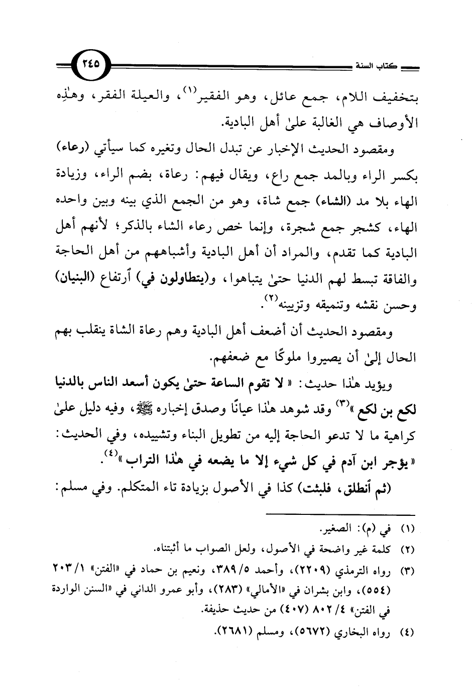 ومقصود الحديث الإخبار عن تبدل الحال وتغيره كما سيأتي (رعاء) بكسر الراء وبالمد جمع راع، ويقال فيهم: رعاة، بضم الراء، وزيادة الهاء بلا مد (الشاء) جمع شاة، وهو من الجمع الذي بينه وبين واحده الهاء، كشجر جمع شجرة، وإنما خص رعاء الشاء بالذكر؛ لأنهم أهل البادية كما تقدم، والمراد أن أهل البادية وأشباههم من أهل الحاجة والفاقة تبسط لهم الدنيا حتى يتباهوا، و (يتطاولون في) ارتفاع (البنيان) وحسن نقشه وتنميقه وتزيينه (¬2).