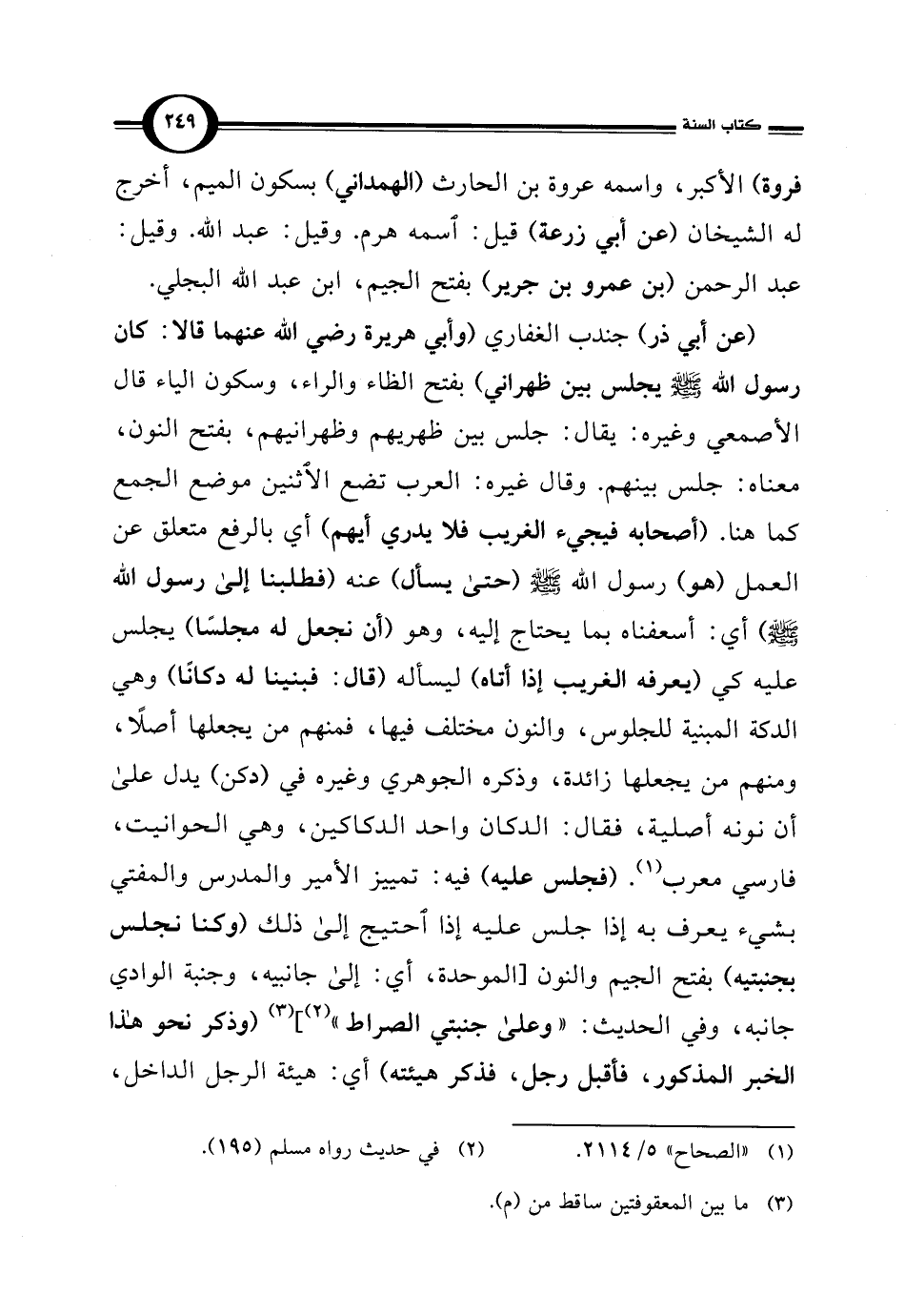 (عن أبي ذر) جندب الغفاري (وأبي هريرة رضي اللَّه عنهما قالا: كان رسول اللَّه -صلى اللَّه عليه وسلم- يجلس بين ظهراني) بفتح الظاء والراء، وسكون الياء قال الأصمعي وغيره: يقال: جلس بين ظهريهم وظهرانيهم، بفتح النون، معناه: جلس بينهم. وقال غيره: العرب تضع الاثنين موضع الجمع كما هنا. (أصحابه فيجيء الغريب فلا يدري أيهم) أي بالرفع متعلق عن العمل (هو) رسول اللَّه -صلى اللَّه عليه وسلم- (حتى يسأل) عنه (فطلبنا إلى رسول اللَّه -صلى اللَّه عليه وسلم-) أي: أسعفناه بما يحتاج إليه، وهو (أن نجعل له مجلسًا) يجلس عليه كي (يعرفه الغريب إذا أتاه) ليسأله (قال: فبنينا له دكانًا) وهي الدكة المبنية للجلوس، والنون مختلف فيها، فمنهم من يجعلها أصلًا، ومنهم من يجعلها زائدة، وذكره الجوهري وغيره في (دكن) يدل على أن نونه أصلية، فقال: الدكان واحد الدكاكين، وهي الحوانيت، فارسي معرب (¬1). (فجلس عليه) فيه: تمييز الأمير والمدرس والمفتي بشيء يعرف به إذا جلس عليه إذا احتيج إلى ذلك (وكنا نجلس بجنبتيه) بفتح الجيم والنون [الموحدة، أي: إلى جانبيه، وجنبة الوادي جانبه، وفي الحديث: "وعلى جنبتي الصراط" (¬2)] (¬3) (وذكر نحو هذا الخبر المذكور، فأقبل رجل، فذكر هيئته) أي: هيئة الرجل الداخل،