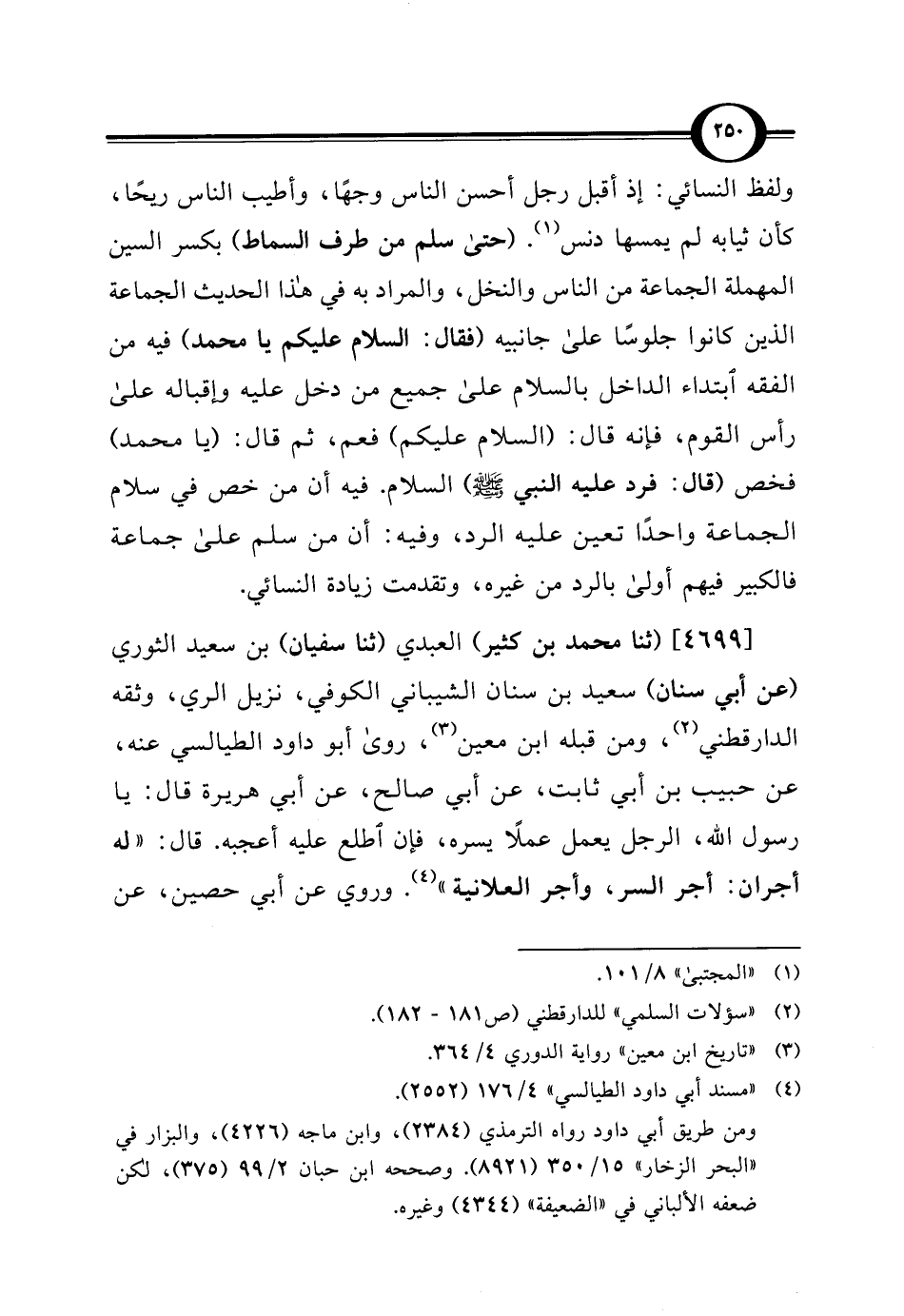 [4699] (ثنا محمد بن كثير) العبدي (ثنا سفيان) بن سعيد الثوري (عن أبي سنان) سعيد بن سنان الشيباني الكوفي، نزيل الري، وثقه الدارقطني (¬2)، ومن قبله ابن معين (¬3)، روى أبو داود الطيالسي عنه، عن حبيب بن أبي ثابت، عن أبي صالح، عن أبي هريرة قال: يا رسول اللَّه، الرجل يعمل عملًا يسره، فإن أطلع عليه أعجبه. قال: "له أجران: أجر السر، وأجر العلانية" (¬4). وروي عن أبي حصين، عن