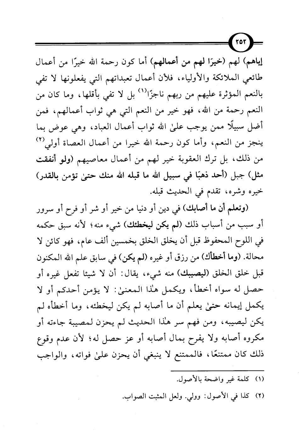 (وتعلم أن ما أصابك) في دين أو دنيا من خير أو شر أو فرح أو سرور أو سبب من أسباب ذلك (لم يكن ليخطئك) شيء منه؛ لأنه سبق حكمه في اللوح المحفوظ قبل أن يخلق الخلق بخمسين ألف عام، فهو كائن لا محالة. (وما أخطأك) من رزق أو غيره (لم يكن) في سابق علم اللَّه المكنون قبل خلق الخلق (ليصيبك) منه شيء، يقال: أن لا شيئا تفعل غيره أو حصل له سواه أخطأ، ويكمل هذا المعنى: لا يؤمن أحدكم أو لا يكمل إيمانه حتى يعلم أن ما أصابه لم يكن ليخطئه، وما أخطأه لم يكن ليصيبه، ومن فهم سر هذا الحديث لم يحزن لمصيبة جاءته أو مكروه أصابه ولا يفرح بمال أصابه أو عز حصل له؛ لأن عدم وقوع ذلك كان ممتنعًا، فالممتنع لا ينبغي أن يحزن على فواته، والواجب
