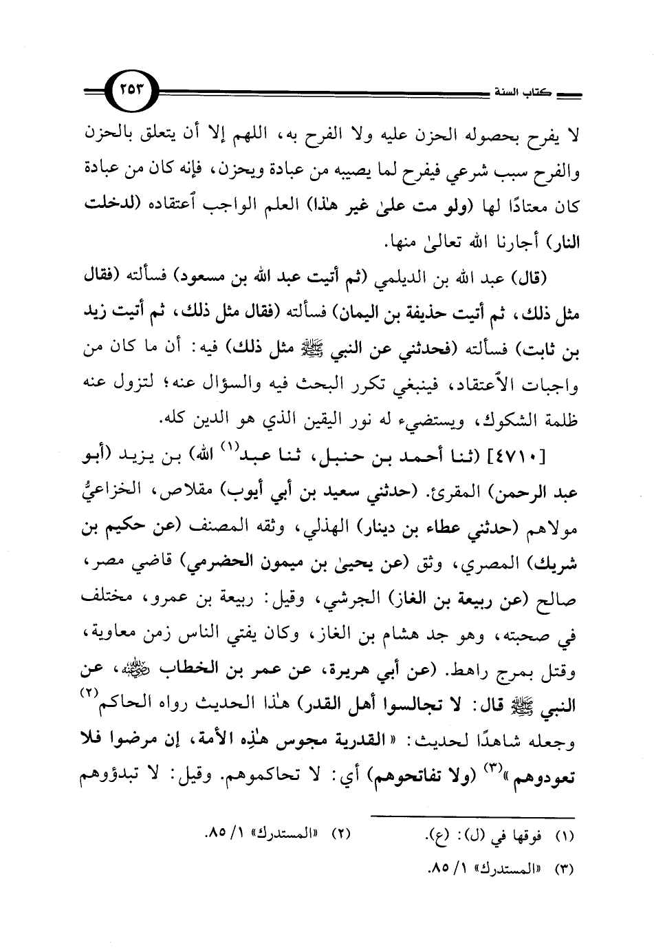 [4710] (ثنا أحمد بن حنبل، ثنا عبد (¬1) اللَّه) بن يزيد (أبو عبد الرحمن) المقرئ. (حدثني سعيد بن أبي أيوب) مقلاص، الخزاعيُّ مولاهم (حدثني عطاء بن دينار) الهذلي، وثقه المصنف (عن حكيم بن شريك) المصري، وثق (عن يحيى بن ميمون الحضرمي) قاضي مصر، صالح (عن ربيعة بن الغاز) الجرشي، وقيل: ربيعة بن عمرو، مختلف في صحبته، وهو جد هشام بن الغاز، وكان يفتي الناس زمن معاوية، وقتل بمرج راهط. (عن أبي هريرة، عن عمر بن الخطاب -رضي اللَّه عنه-، عن النبي -صلى اللَّه عليه وسلم- قال: لا تجالسوا أهل القدر) هذا الحديث رواه الحاكم (¬2) وجعله شاهدًا لحديث: "القدرية مجوس هذِه الأمة، إن مرضوا فلا تعودوهم" (¬3) (ولا تفاتحوهم) أي: لا تحاكموهم. وقيل: لا تبدؤوهم