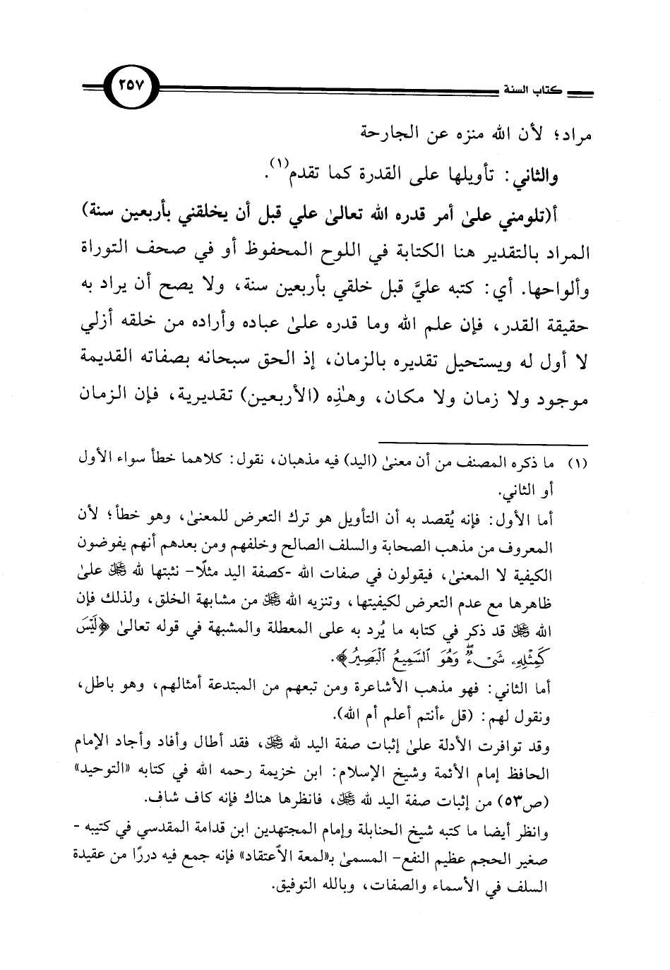 وانظر أيضًا ما كتبه شيخ الحنابلة وإمام المجتهدين ابن قدامة المقدسي في كتيبه -صغير الحجم عظيم النفع- المسمى بـ "لمعة الاعتقاد" فإنه جمع فيه دررًا من عقيدة السلف في الأسماء والصفات، وباللَّه التوفيق.