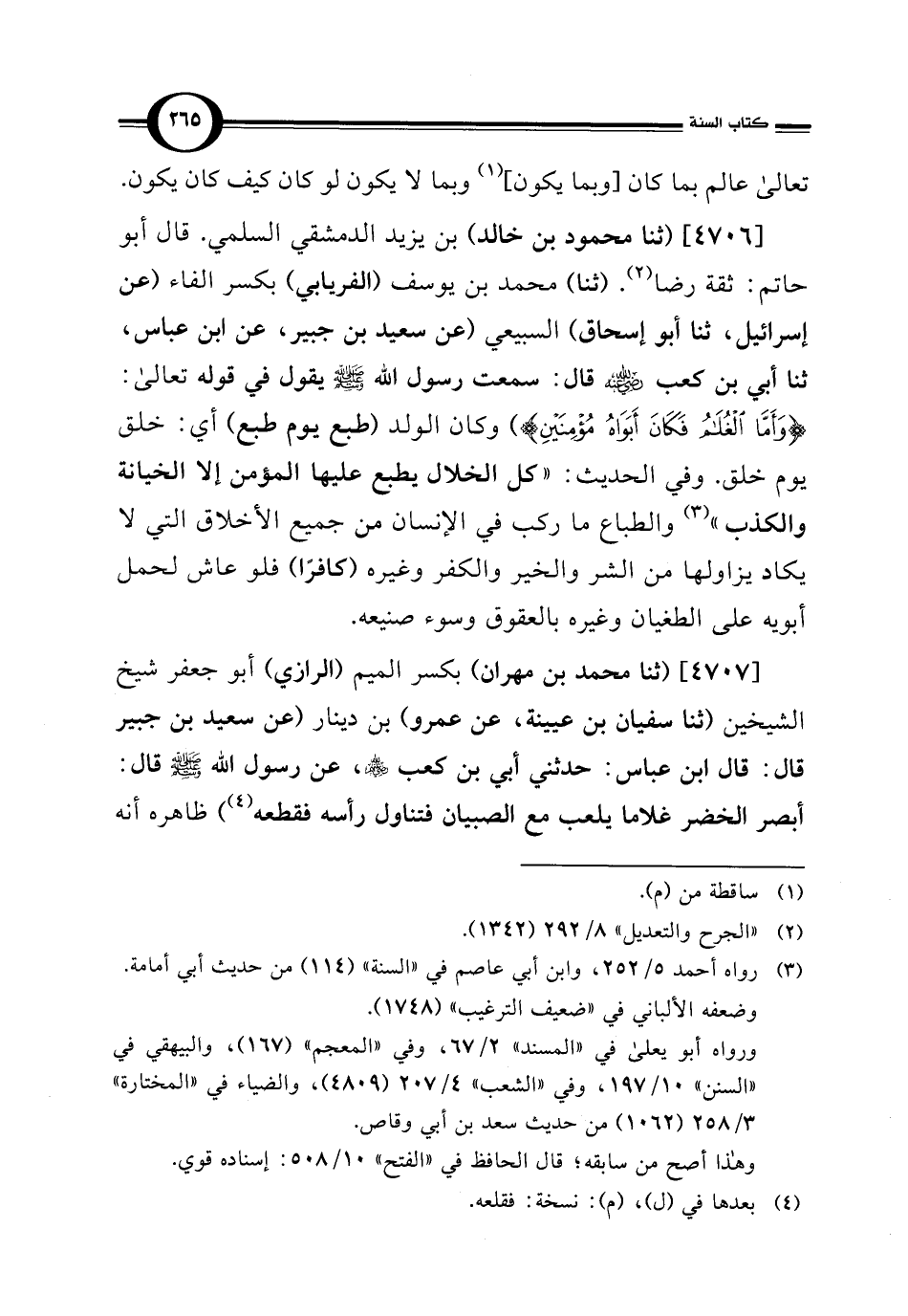 [4706] (ثنا محمود بن خالد) بن يزيد الدمشقي السلمي. قال أبو حاتم: ثقة رضا (¬2). (ثنا) محمد بن يوسف (الفريابي) بكسر الفاء (عن إسرائيل، ثنا أبو إسحاق) السبيعي (عن سعيد بن جبير، عن ابن عباس، ثنا أبي بن كعب -رضي اللَّه عنه- قال: سمعت رسول اللَّه -صلى اللَّه عليه وسلم- يقول في قوله تعالى: {وَأَمَّا الْغُلَامُ فَكَانَ أَبَوَاهُ مُؤْمِنَيْنِ}) وكان الولد (طبع يوم طبع) أي: خلق يوم خلق. وفي الحديث: "كل الخلال يطبع عليها المؤمن إلا الخيانة والكذب" (¬3) والطباع ما ركب في الإنسان من جميع الأخلاق التي لا يكاد يزاولها من الشر والخير والكفر وغيره (كافرًا) فلو عاش لحمل أبويه على الطغيان وغيره بالعقوق وسوء صنيعه.