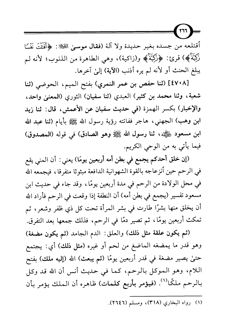 [4708] (ثنا حفص بن عمر النمري) بفتح الميم، الحوضي (ثنا شعبة، وثنا محمد بن كثير) العبدي (ثنا سفيان) الثوري (المعنى واحد، والإخبار) بكسر الهمزة (في حديث سفيان عن الأعمش، قال: ثنا زيد ابن وهب) الجهني، هاجر ففاتته رؤية رسول اللَّه -صلى اللَّه عليه وسلم- بأيام (ثنا عبد اللَّه ابن مسعود -رضي اللَّه عنه-، ثنا رسول اللَّه -صلى اللَّه عليه وسلم- وهو الصادق) في قوله (المصدوق) فيما يأتي به من الوحي الكريم.
