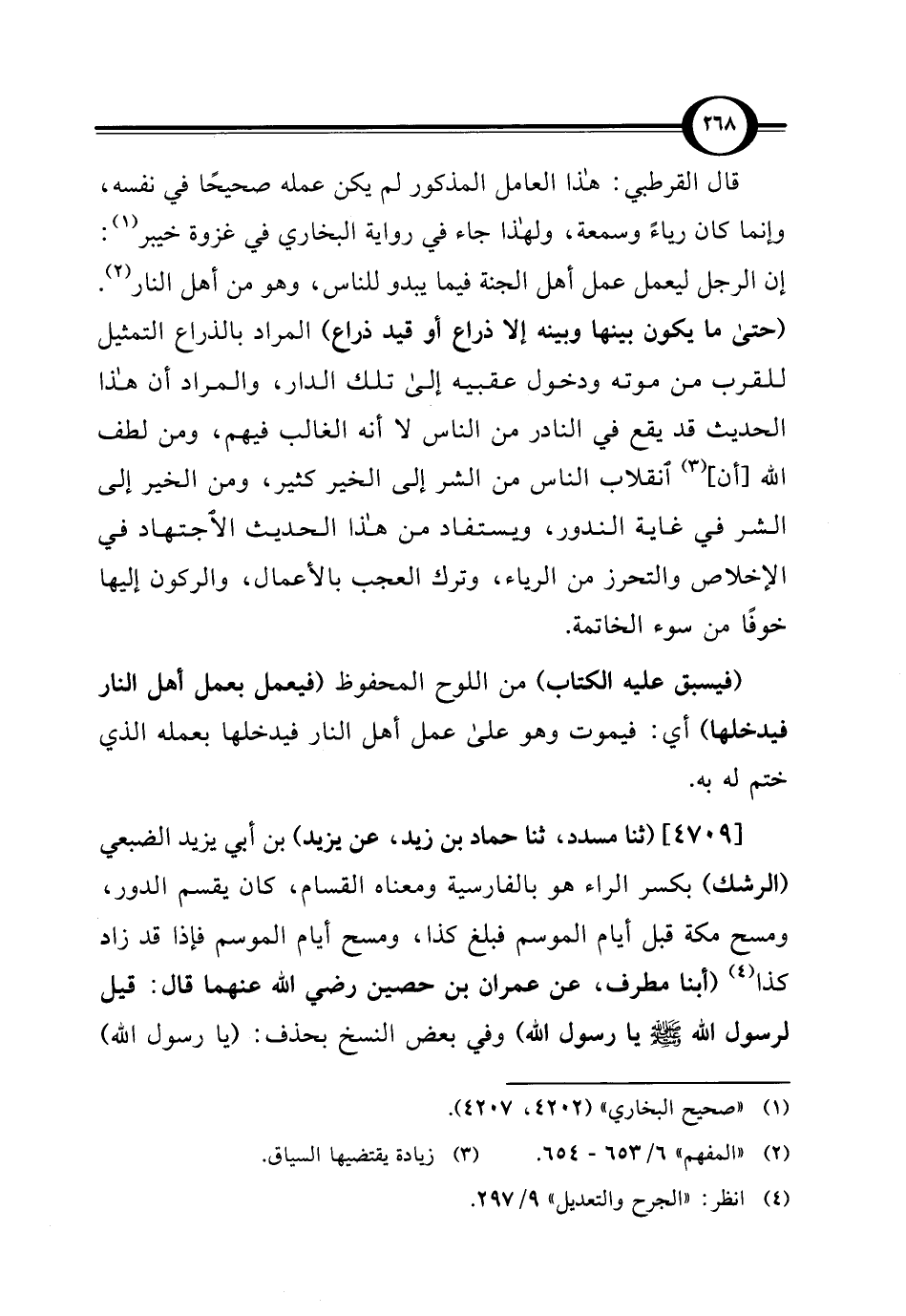 قال القرطبي: هذا العامل المذكور لم يكن عمله صحيحًا في نفسه، وإنما كان رياءً وسمعة، ولهذا جاء في رواية البخاري في غزوة خيبر (¬1): إن الرجل ليعمل عمل أهل الجنة فيما يبدو للناس، وهو من أهل النار (¬2). (حتى ما يكون بينها وبينه إلا ذراع أو قيد ذراع) المراد بالذراع التمثيل للقرب من موته ودخول عقبيه إلى تلك الدار، والمراد أن هذا الحديث قد يقع في النادر من الناس لا أنه الغالب فيهم، ومن لطف اللَّه [أن] (¬3) انقلاب الناس من الشر إلى الخير كثير، ومن الخير إلى الشر في غاية الندور، ويستفاد من هذا الحديث الاجتهاد في الإخلاص والتحرز من الرياء، وترك العجب بالأعمال، والركون إليها خوفًا من سوء الخاتمة.