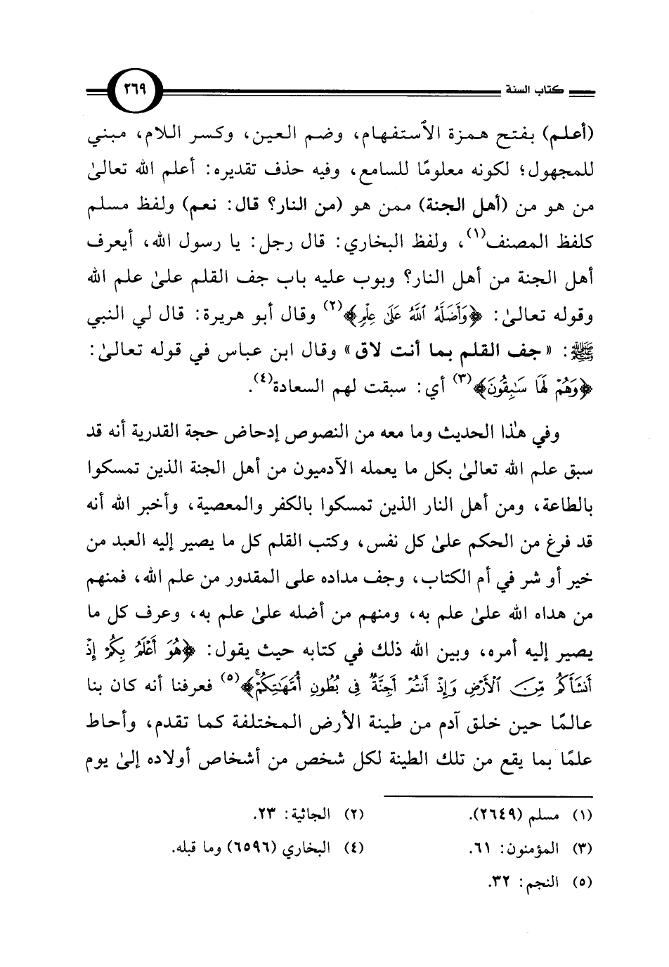 وفي هذا الحديث وما معه من النصوص إدحاض حجة القدرية أنه قد سبق علم اللَّه تعالى بكل ما يعمله الآدميون من أهل الجنة الذين تمسكوا بالطاعة، ومن أهل النار الذين تمسكوا بالكفر والمعصية، وأخبر اللَّه أنه قد فرغ من الحكم على كل نفس، وكتب القلم كل ما يصير إليه العبد من خير أو شر في أم الكتاب، وجف مداده على المقدور من علم اللَّه، فمنهم من هداه اللَّه على علم به، ومنهم من أضله على علم به، وعرف كل ما يصير إليه أمره، وبين اللَّه ذلك في كتابه حيث يقول: {هُوَ أَعْلَمُ بِكُمْ إِذْ أَنْشَأَكُمْ مِنَ الْأَرْضِ وَإِذْ أَنْتُمْ أَجِنَّةٌ فِي بُطُونِ أُمَّهَاتِكُمْ} (¬5) فعرفنا أنه كان بنا عالمًا حين خلق آدم من طينة الأرض المختلفة كما تقدم، وأحاط علمًا بما يقع من تلك الطينة لكل شخص من أشخاص أولاده إلى يوم