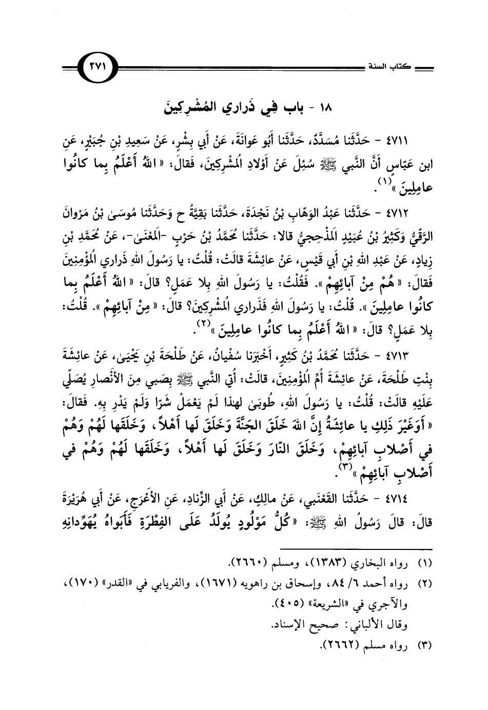4711 - حَدَّثَنَا مُسَدَّدٌ، حَدَّثَنَا أَبُو عَوانَةَ، عَنْ أَبي بِشْرٍ، عَنْ سَعِيدِ بْنِ جُبَيْرٍ، عَنِ ابن عَبّاسٍ أَنَّ النَّبي -صلى اللَّه عليه وسلم- سُئِلَ عَنْ أَوْلادِ المُشْرِكِينَ، فَقالَ: "اللَّهُ أَعْلَمُ بِما كانُوا عامِلِينَ" (¬1).