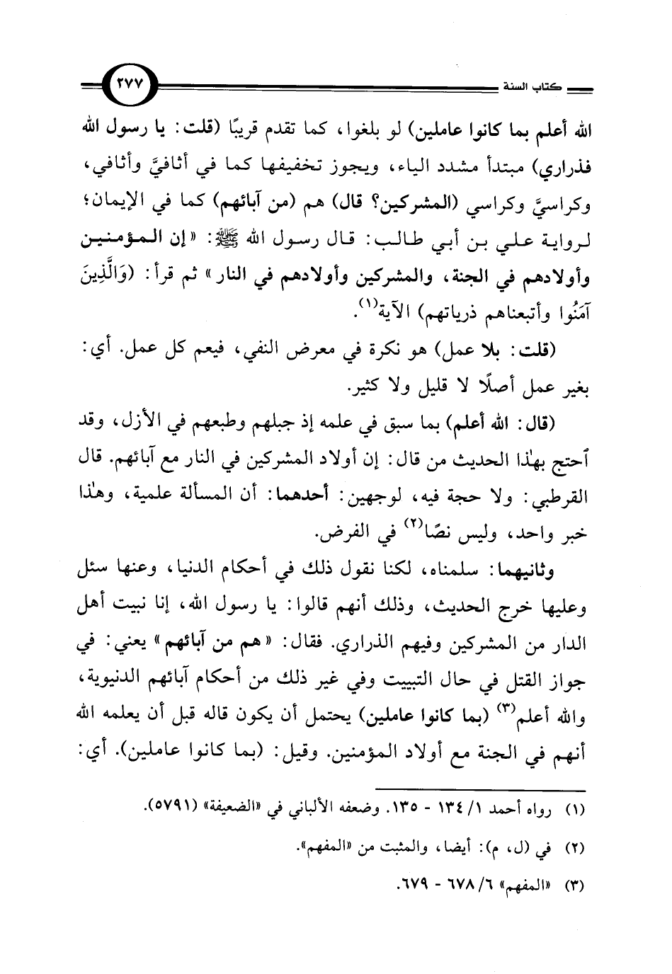 اللَّه أعلم بما كانوا عاملين) لو بلغوا، كما تقدم قريبًا (قلت: يا رسول اللَّه فذراري) مبتدأ مشدد الياء، ويجوز تخفيفها كما في أثافيَّ وأثافي، وكراسيَّ وكراسي (المشركي؟ قال) هم (من آبائهم) كما في الإيمان؛ لرواية علي بن أبي طالب: قال رسول اللَّه -صلى اللَّه عليه وسلم-: "إن المؤمنين وأولادهم في الجنة، والمشركين وأولادهم في النار" ثم قرأ: (وَالَّذِينَ آمَنُوا وأتبعناهم ذرياتهم) الآية (¬1).