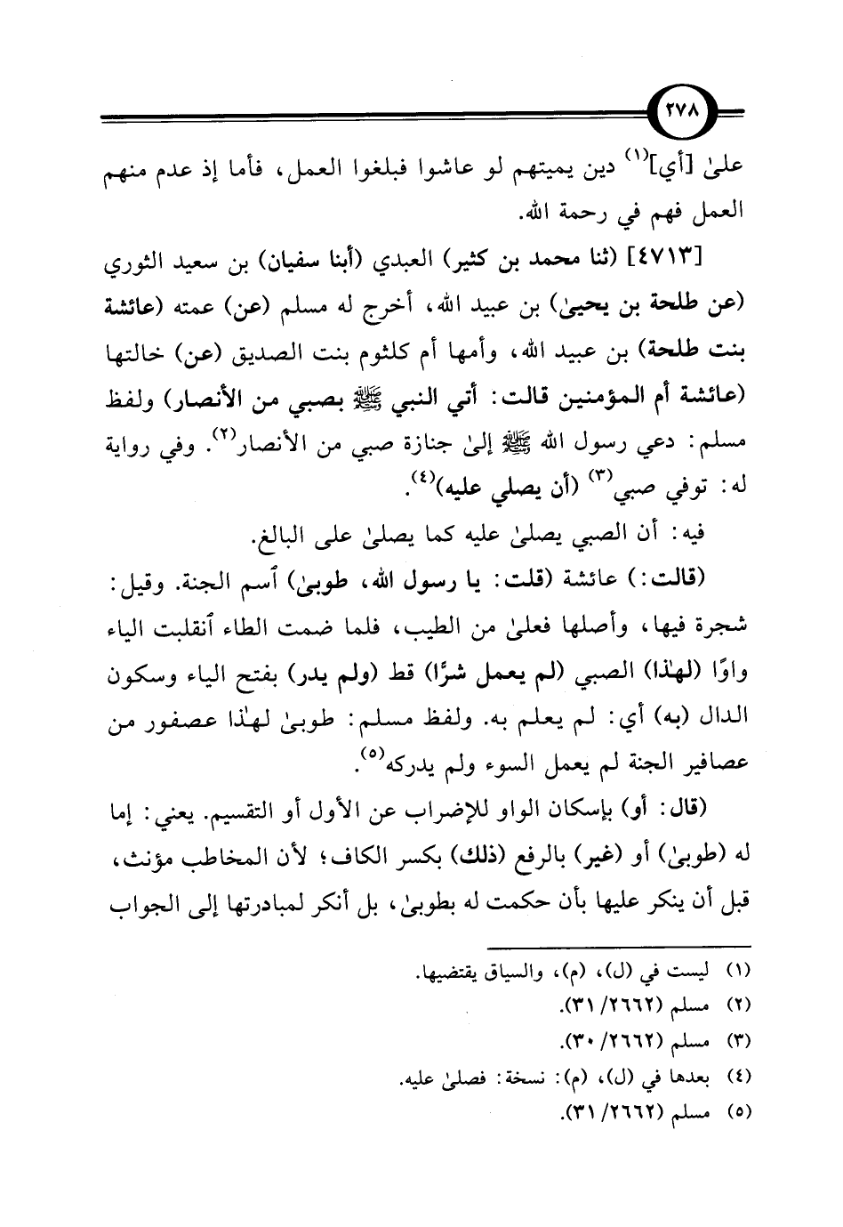[4713] (ثنا محمد بن كثير) العبدي (أبنا سفيان) بن سعيد الثوري (عن طلحة بن يحيى) بن عبيد اللَّه، أخرج له مسلم (عن) عمته (عائشة بنت طلحة) بن عبيد اللَّه، وأمها أم كلثوم بنت الصديق (عن) خالتها (عائشة أم المؤمنين قالت: أتي النبي -صلى اللَّه عليه وسلم- بصبي من الأنصار) ولفظ مسلم: دعي رسول اللَّه -صلى اللَّه عليه وسلم- إلى جنازة صبي من الأنصار (¬2). وفي رواية له: توفي صبي (¬3) (أن يصلي عليه) (¬4).