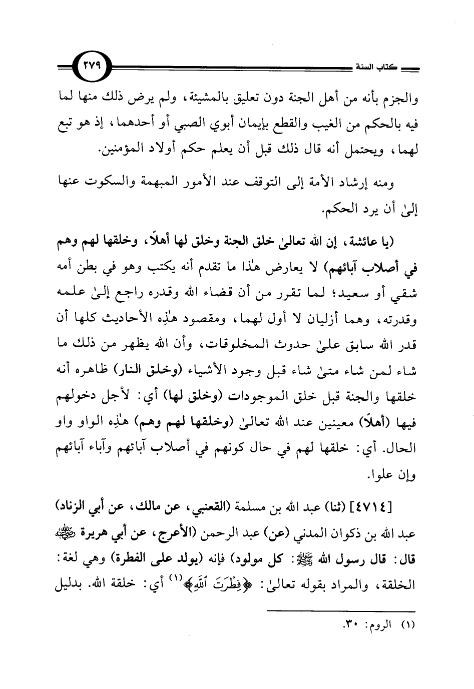 [4714] (ثنا) عبد اللَّه بن مسلمة (القعنبي، عن مالك، عن أبي الزناد) عبد اللَّه بن ذكوان المدني (عن) عبد الرحمن (الأعرج، عن أبي هريرة -رضي اللَّه عنه- قال: قال رسول اللَّه -صلى اللَّه عليه وسلم-: كل مولود (فإنه (يولد على الفطرة) وهي لغة: الخلقة، والمراد بقوله تعالى: {فِطرَتَ اللَّهِ} (¬1) أي: خلقة اللَّه. بدليل