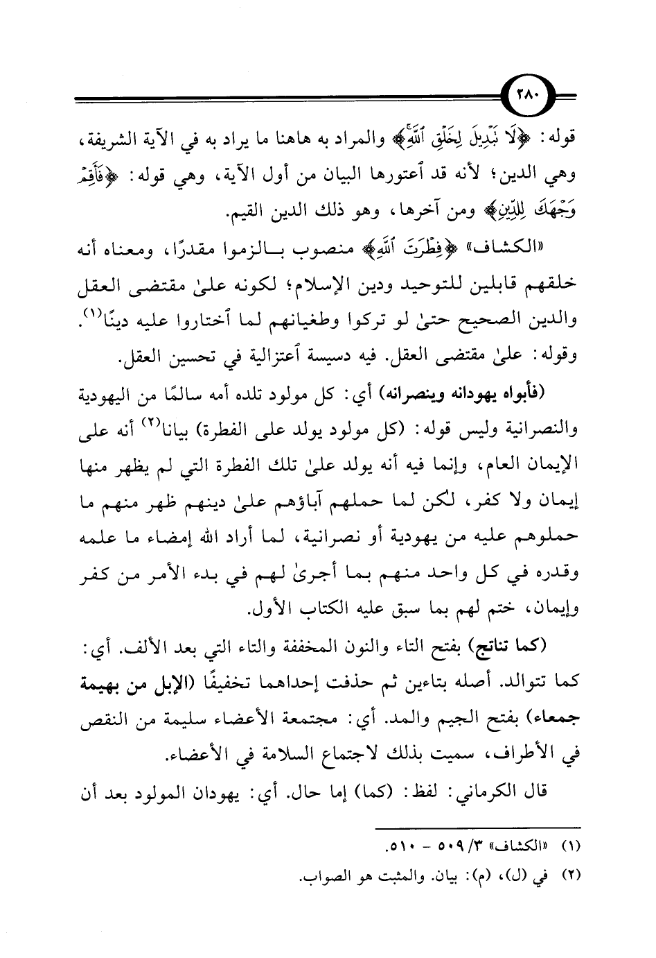 "الكشاف" {فِطْرَتَ اللَّهِ} منصوب بالزموا مقدرًا، ومعناه أنه خلقهم قابلين للتوحيد ودين الإسلام، لكونه على مقتضى العقل والدين الصحيح حتى لو تركوا وطغيانهم لما اختاروا عليه دينا (¬1). وقوله: على مقتضى العقل. فيه دسيسة اعتزالية في تحسين العقل.