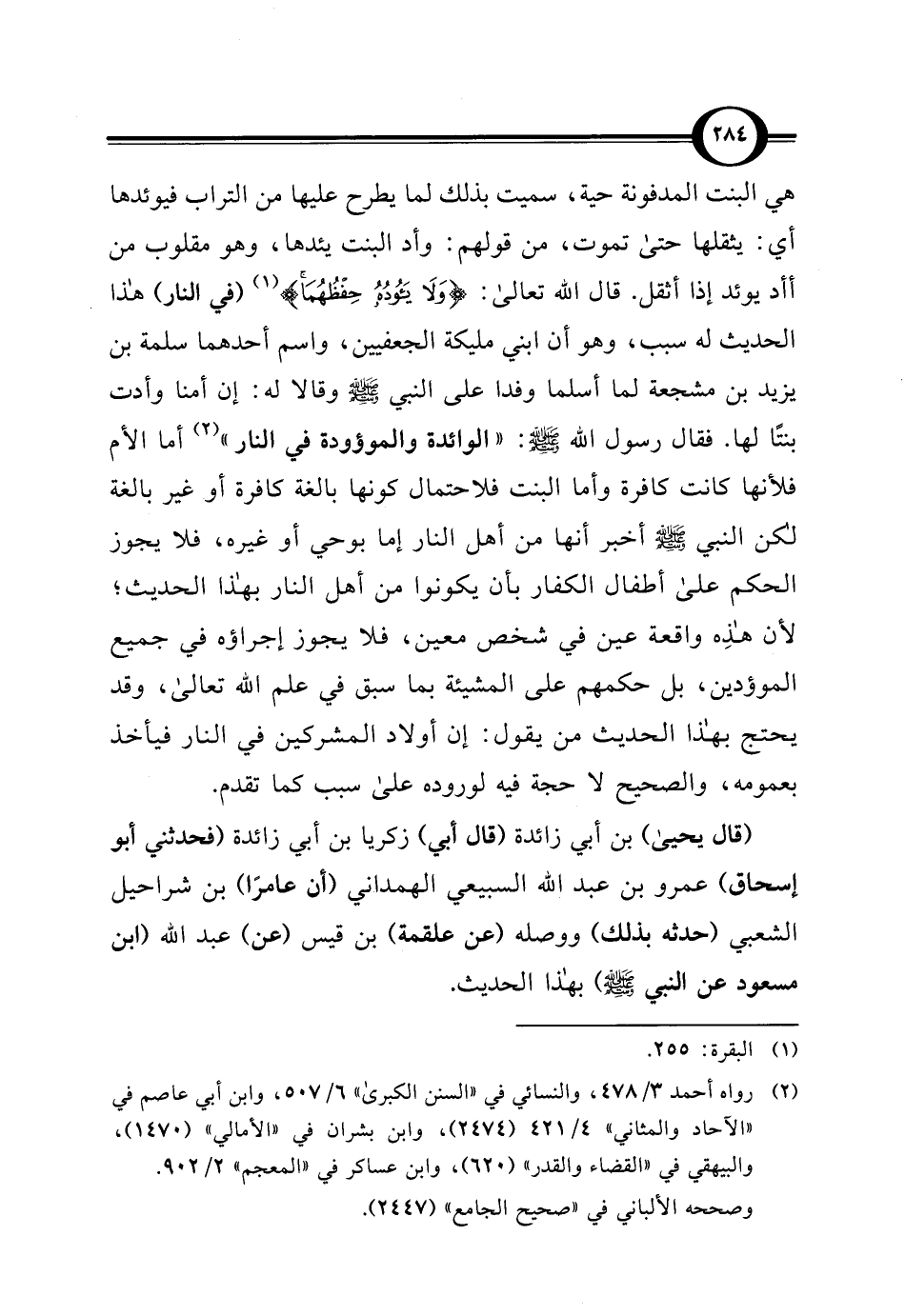 هي البنت المدفونة حية، سميت بذلك لما يطرح عليها من التراب فيوئدها أي: يثقلها حتى تموت، من قولهم: وأد البنت يئدها، وهو مقلوب من أأد يوئد إذا أثقل. قال اللَّه تعالى: {وَلَا يَئُودُهُ حِفْظُهُمَا} (¬1) (في النار) هذا الحديث له سبب، وهو أن ابني مليكة الجعفيين، واسم أحدهما سلمة بن يزيد بن مشجعة لما أسلما وفدا على النبي -صلى اللَّه عليه وسلم- وقالا له: إن أمنا وأدت بنتًا لها. فقال رسول اللَّه -صلى اللَّه عليه وسلم-: "الوائدة والموؤودة في النار" (¬2) أما الأم فلأنها كانت كافرة وأما البنت فلاحتمال كونها بالغة كافرة أو غير بالغة لكن النبي -صلى اللَّه عليه وسلم- أخبر أنها من أهل النار إما بوحي أو غيره، فلا يجوز الحكم على أطفال الكفار بأن يكونوا من أهل النار بهذا الحديث؛ لأن هذِه واقعة عين في شخص معين، فلا يجوز إجراؤه في جميع الموؤدين، بل حكمهم على المشيئة بما سبق في علم اللَّه تعالى، وقد يحتج بهذا الحديث من يقول: إن أولاد المشركين في النار فيأخذ بعمومه، والصحيح لا حجة فيه لوروده على سبب كما تقدم.
