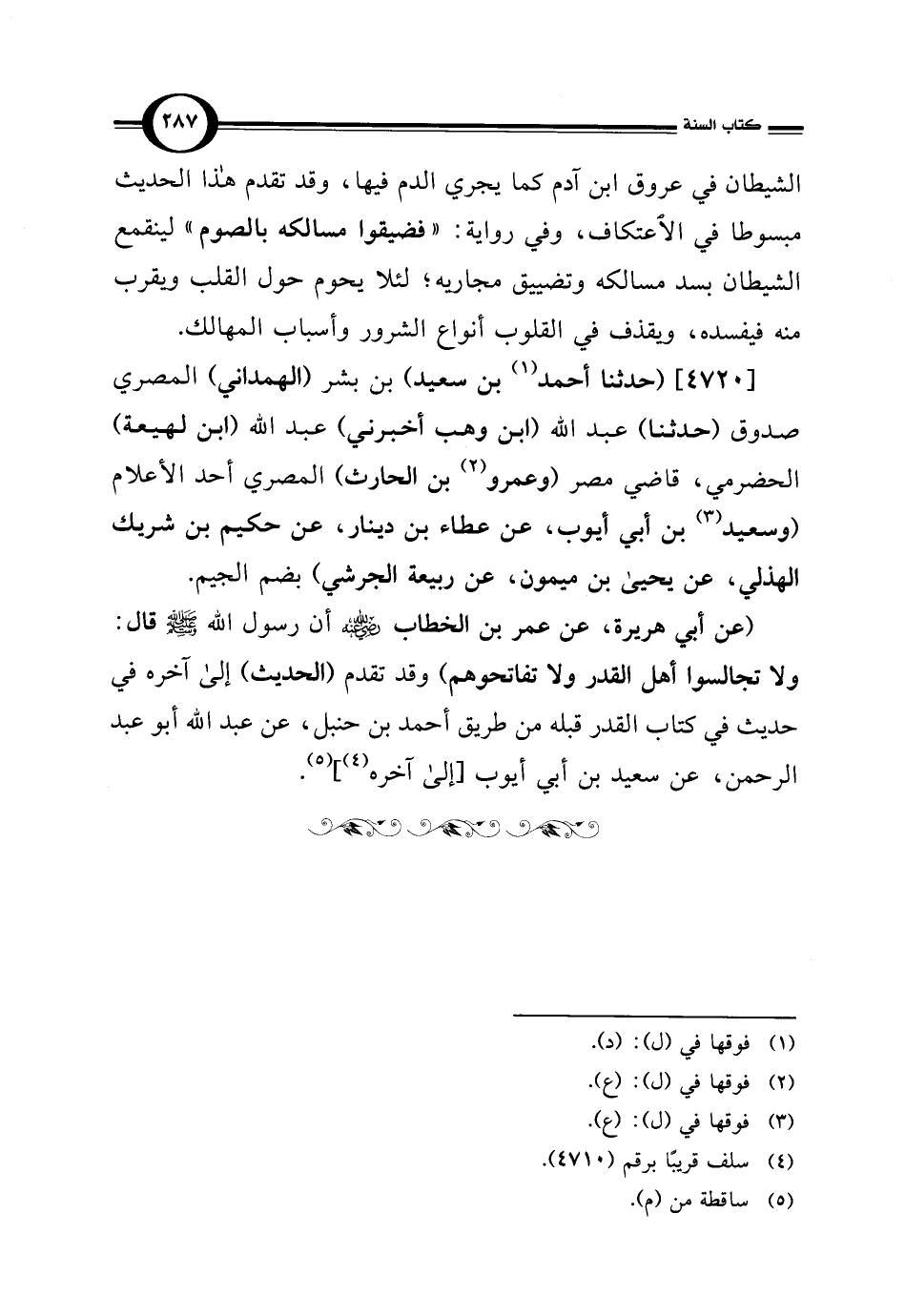 (عن أبي هريرة، عن عمر بن الخطاب -رضي اللَّه عنه- أن رسول اللَّه -صلى اللَّه عليه وسلم- قال: ولا تجالسوا أهل القدر ولا تفاتحوهم) وقد تقدم (الحديث) إلى آخره في حديث في كتاب القدر قبله من طريق أحمد بن حنبل، عن عبد اللَّه أبو عبد الرحمن، عن سعيد بن أبي أيوب [إلى آخره (¬4)] (¬5).