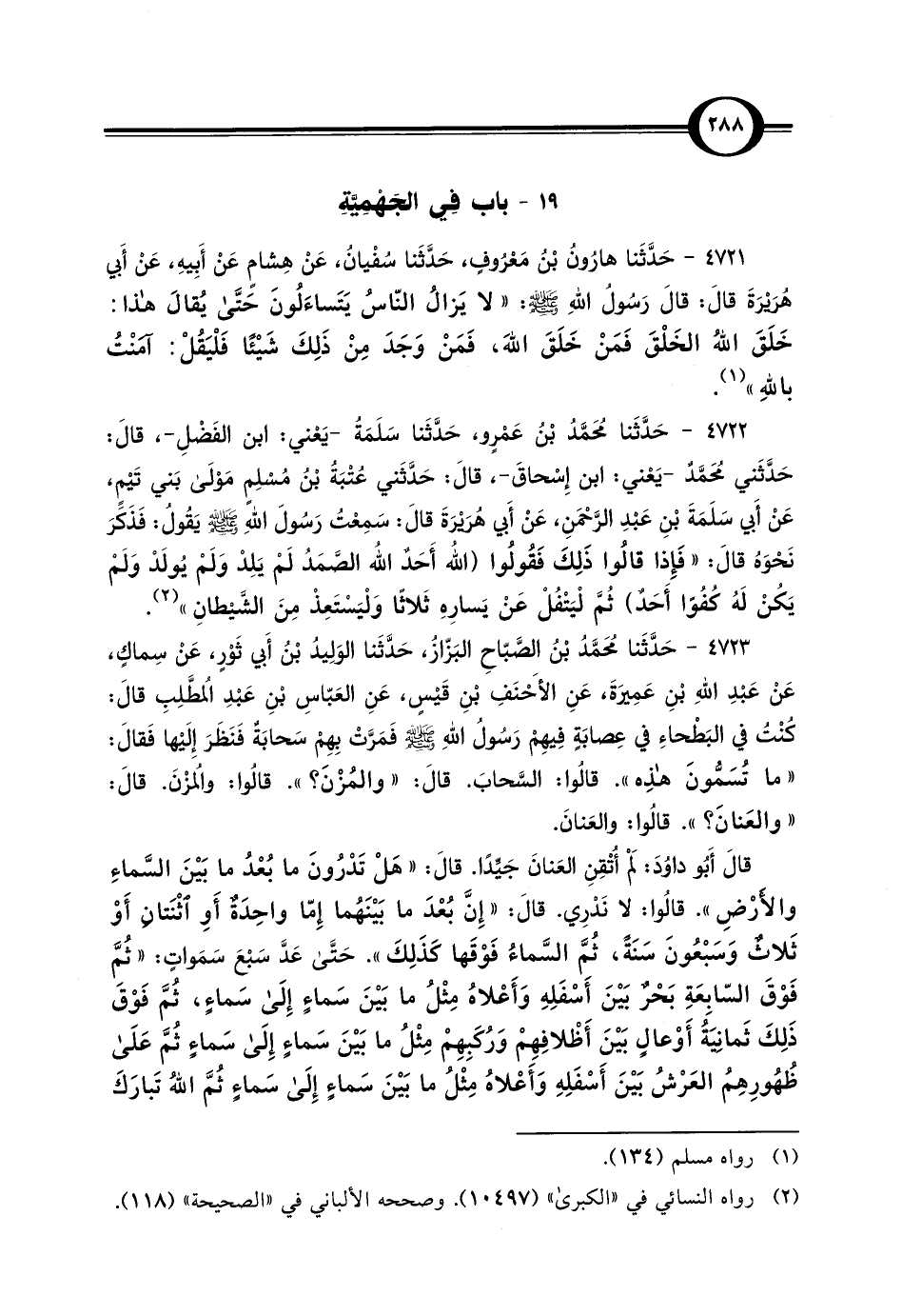4721 - حَدَّثَنَا هَارُونُ بْنُ مَعْرُوفٍ، حَدَّثَنَا سُفْيانُ، عَنْ هِشامٍ عَنْ أَبِيهِ، عَنْ أَبِي هُرَيْرَةَ قالَ: قالَ رَسُولُ اللَّهِ -صلى اللَّه عليه وسلم-: "لا يَزالُ النَّاسُ يَتَساءَلُونَ حَتَّى يُقَالَ هذا: خَلَقَ اللَّه الخَلْقَ فَمَنْ خَلَقَ اللَّهَ، فَمَنْ وَجَدَ مِنْ ذَلِكَ شَيْئًا فَلْيَقُلْ: آمنْتُ باللَّهِ" (¬1).