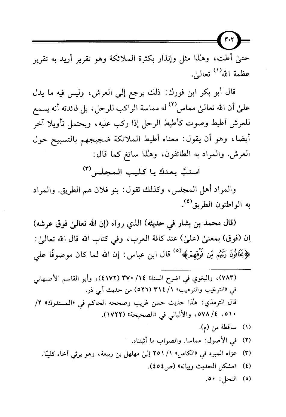 قال أبو بكر ابن فورك: ذلك يرجع إلى العرش، وليس فيه ما يدل على أن اللَّه تعالى مماس (¬2) له مماسة الراكب للرحل، بل فائدته أنه يسمع للعرش أطيط وصوت كأطيط الرحل إذا ركب عليه، ويحتمل تأويلا آخر أيضًا، وهو أن يقول: معناه أطيط الملائكة ضجيجهم بالتسبيح حول العرش. والمراد به الطائفون، وهذا سائغ كما قال:
